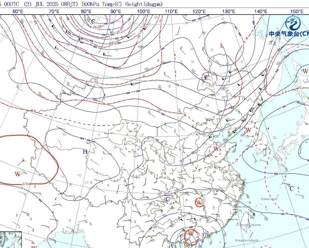 从今天的天气实况图来看,副热带高压依然控制我国中部,比如湖北、河南、安徽、江苏以