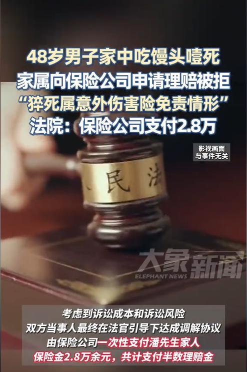 上海,一男子在家中突然猝死,后经诊断其喉部还有未咽下的馒头,怀疑是噎死的。家属料理完后事想起买过10万元意外险,找保险公司理赔却遭拒。保险公司称噎死不算意外,且男子有基础病属免责情形。双方争执不下,最终对簿公堂。 7月20日,大象新闻报道了一起争议较大的案子。在2023年11月的一天,48岁的潘先生和母亲正坐在桌子前吃着馒头。 潘先生平时吃饭都比较快,所以一个馒头三下五除二很快就解决了,母亲多次提醒让他吃慢点,但也没有任何效果。 突然,潘先生面色涨得通红,他还不停地用手捶打胸口。母亲一看就知道潘先生是噎着了,准备去弄点水来。可还没等她离开,潘先生就直挺挺地倒在了地上。 母亲被吓了一跳,她立即上前查看,但潘先生好像失去了意识。母亲顿时慌了起来,她跌跌撞撞地跑到邻居家门口,希望邻居能帮下忙。 邻居上门查看情况后,立即叫了救护车。可等医护人员赶到现场检查了潘先生的情况后,无奈地摇了摇头,表示潘先生已经死亡。 由于潘先生死因蹊跷,所以相关部门进行了尸检,结果发现潘先生的咽喉部还有没咽下去的馒头,大概率是被噎死的。后死亡证明上则登记了死因为猝死。 潘先生去世后,家人们整理了下他的遗物,发现了一张7年前购买的意外伤害险合同,合同有效期至2047年,保险理赔金是10万元。 由于潘先生已经意外死亡,所以家人们就认为保险公司应当兑付这笔保险金。可当他们找保险公司办业务时,却遭到了拒绝。 保险公司的一位工作人员指着保险合同上的条款说:“被保险人因潜在疾病24小时内突然死亡,属于免责范围。” 该工作人员认为,潘先生自身有心脏早搏和高血压等问题,死亡的真正原因是自身疾病所致,不是意外事件,所以不符合赔偿条件。 潘先生的家人肯定不认可这样的说法,他们认为被馒头噎死就是属于意外,保险公司这样解释无非就是排除自身责任。 保险公司坚持认为这不属于意外事件,而且潘先生当初签合同时就已经知道了合同条款内容,双方都是自愿签订的合同,所以应该按照合同约定的来办理。 双方各执一词,吵得不可开交,最终只能闹上了法庭。 在法庭上,保险公司提交了拒赔的两个理由: 第一,潘先生在火化后,其家人才来通知理赔,这剥夺了保险公司的取证权益,无法确定潘先生的真正死因。 第二,潘先生自身患有多种疾病,且有极大可能是疾病导致死亡,这属于保险合同中的免赔事由。 但潘先生的家属认为,死亡鉴定报告上显示就是猝死,这属于意外事件,所以保险公司应当赔偿。 那法院会怎么判? 《保险法》第21条规定,投保人、被保险人或者受益人知道保险事故发生后,应当及时通知保险人。故意或者因重大过失未及时通知,致使保险事故的性质、原因、损失程度等难以确定的,保险人对无法确定的部分,不承担赔偿或者给付保险金的责任,但保险人通过其他途径已经及时知道或者应当及时知道保险事故发生的除外。 从上述规定来看,保险公司的第一点理由其实没错,潘先生直到火化后,其家人才通知了保险公司,不符合法律的要求。 法院认为,潘先生的家属在这个问题上存在一定过错。只是该过错不足以让保险公司完全不承担责任。 法院认为,保险合同中的免责条款必须在签订合同期间,由保险人作出足以引起投保人注意的提示,并对该条款的内容以书面或者口头形式向投保人作出明确说明。如果未作提示或者未明确说明的,该条款不产生效力。 其实保险合同的部分条款都是固定格式的,所以俗称格式合同。对于格式合同,法律上有明确要求:格式条款的提供方不合理地免除或者减轻自身责任、加重对方责任或限制对方主要权利的,该合同条款不发生效力。 因此,保险公司虽然主张合同中有相关的约定,但同时也要证明已经将相关约定告知了潘先生。 根据《民事诉讼法》第67条规定,当事人对自己提出的主张,有责任提供相应的证据。 本案中,保险公司并未提交证据证明已经对潘先生尽到了告知义务,说该格式条款不发生法律效力。 也就是说,保险合同中关于非意外死亡不赔偿的约定是无效的。 最终,法院经过2个小时的调解,终于让潘先生的家属和保险公司达成了一致意见。由保险公司支付潘先生家属4.8万元的理赔金。 信息来源:大象新闻 2025年7月20日 #头号创作者激励计划#