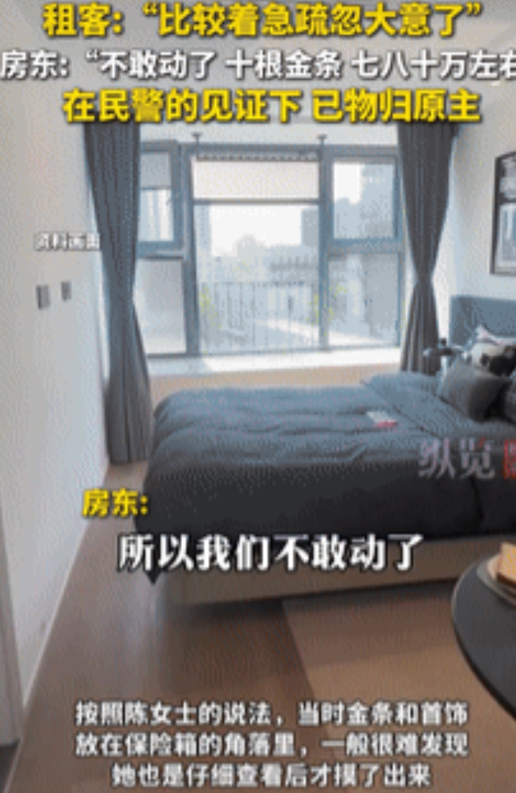 江苏苏州,租客小赵租了李女士的房子半年,到期搬走三天后,李女士打扫屋子。她记得小赵曾用旧保险箱存贵重物品且给了备用密码,打开后竟发现价值近百万的10根金条。李女士没贪心,果断报了警。民警联系小赵,他起初还以为是诈骗,后来想起是自己疏忽遗漏。