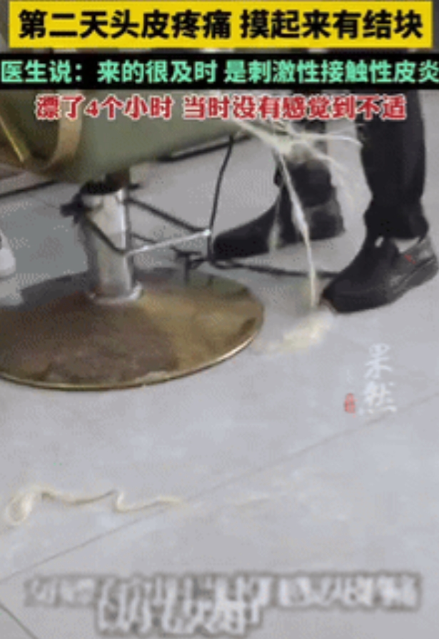 这位女子花350元做了漂发,全程4个小时里没觉得头皮疼,可吹头发时,头发却一缕缕往下掉,她本以为只是头发中段断裂,没太在意,没想到第二天头皮又疼又肿,摸起来还有结块。