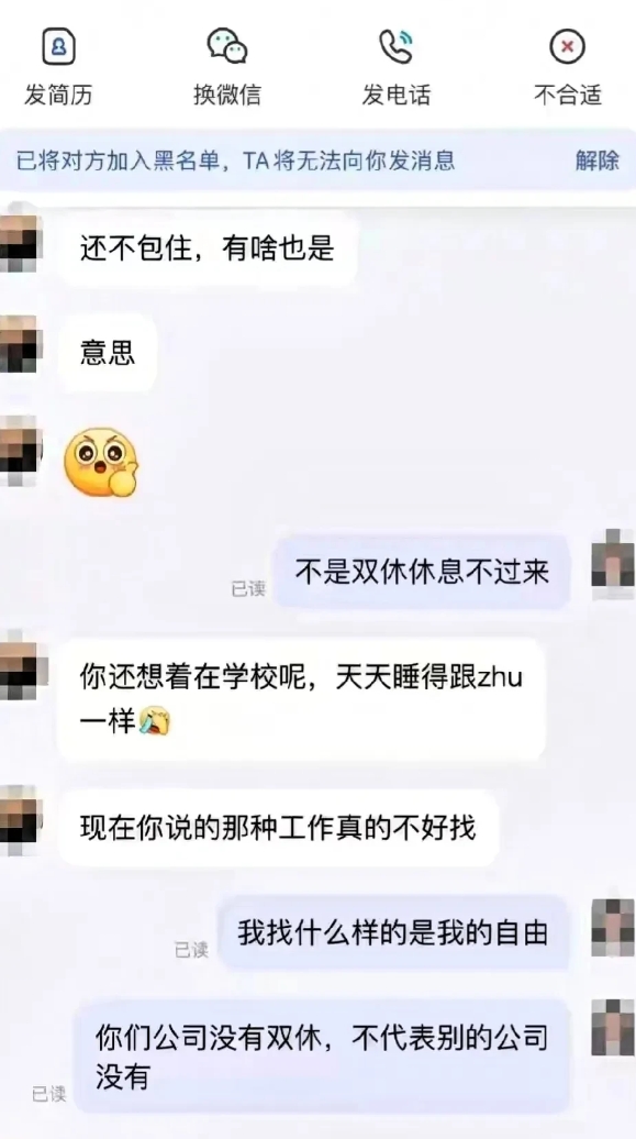 也有人说,仔细看看聊天对话,求职者说不是双休不过来,对方才说的跟学校一样,睡的像猪一样。