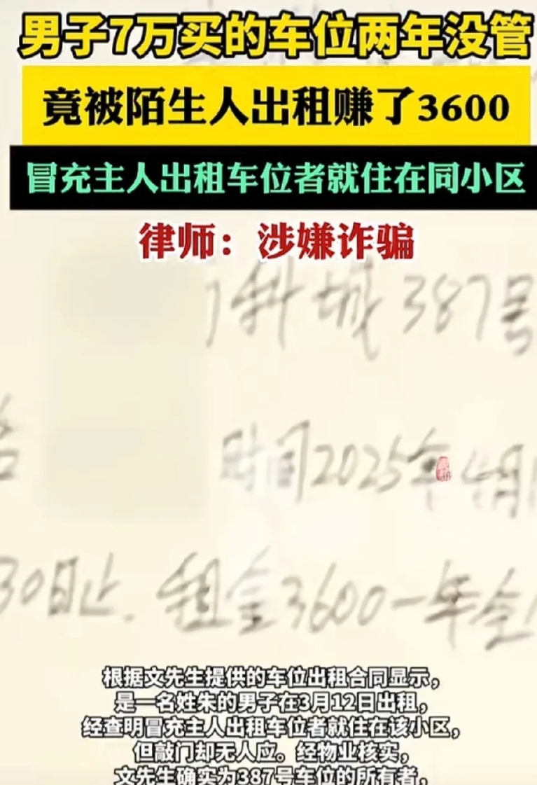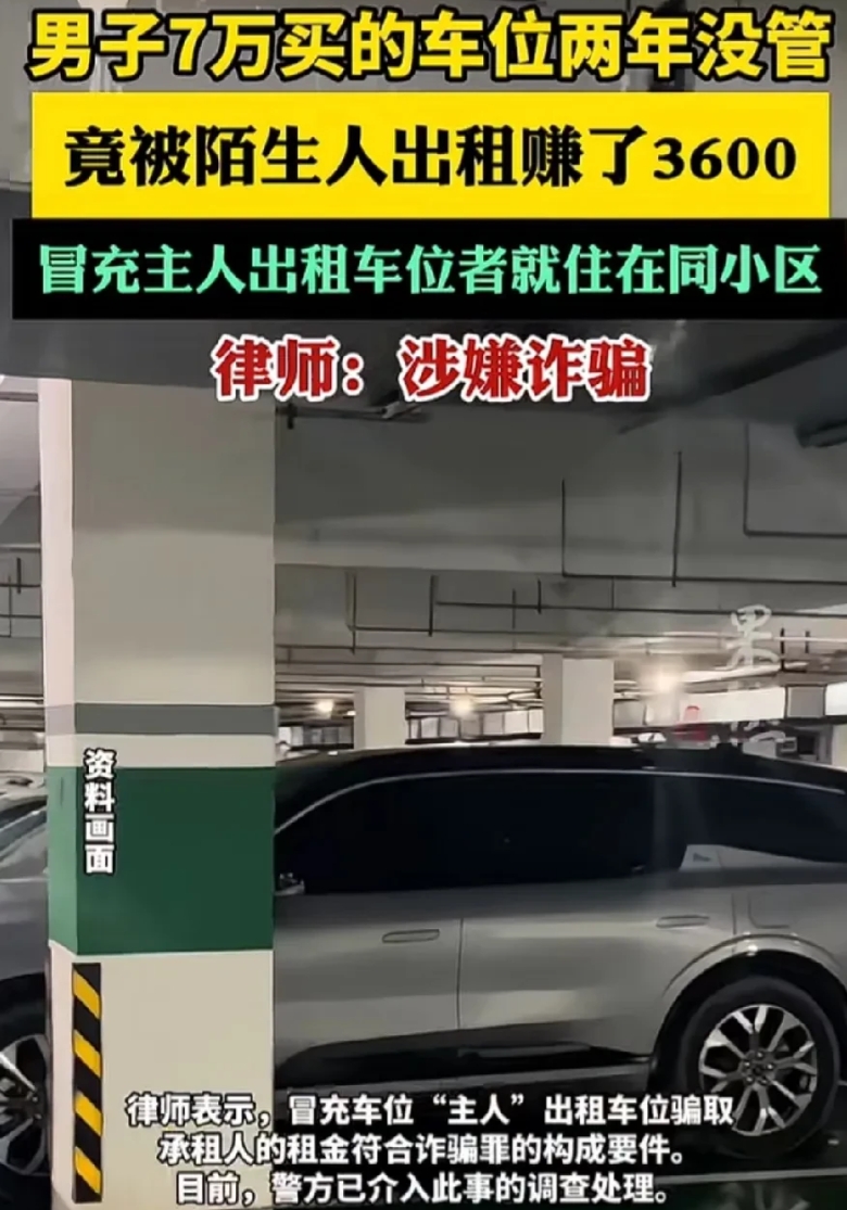 信息来源:风芒新闻 《谱!7万买的车位两年没管 被陌生人出租赚3600 冒充主人出租车位者就住小区 敲门无人应》2025-7-19