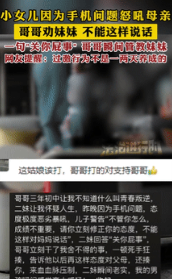 事情的起因,是13岁的妹妹沉迷手机游戏,每天熬到半夜,妈妈担心伤眼睛,趁她睡觉时收了手机,没想到小敏醒来发现手机不见,立刻冲着妈妈发火,她把抱枕摔在地上,还冲妈妈尖叫“你凭什么管我”,连哥哥过来劝她“跟妈妈说句软话”,都被她吼“关你屁事”。