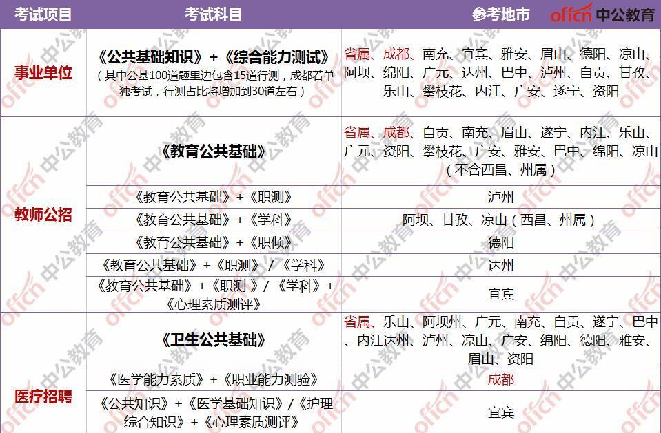 下半年的考编大家可以准备起来了! 部分地市2026届高校毕业生不能参考,所以相对上半年,下半年竞争会小一些!早学习早提分! 图1:该表仅供参考,为参考去年下半年四川事业单位招录要求情况,今年是否能报考还是以今年公告为准 图2:四川各地事业单位、教师、医疗考试科目 成都7.25(市区)、7月30日(基地)、7月28日院长班(基地) 凉山7.18、阿坝7.20、泸州7.21、巴中7.25、宜宾7.26、达州7.30