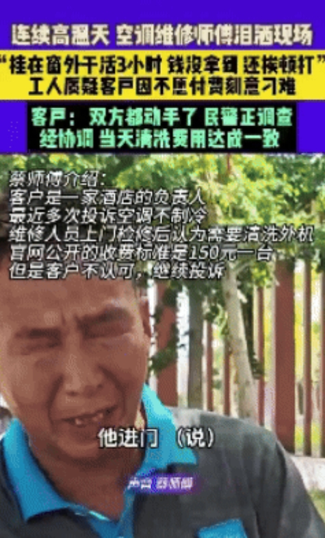 事情的起因并不复杂,蔡师傅接了一个订单,为当地一家酒店维修空调,对方一开始嫌报价150元太贵,磨叽了一阵子才点头答应。