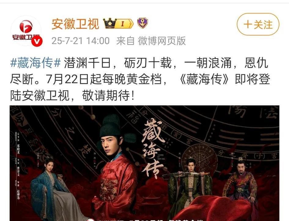 《藏海传》7.22号东南卫视、安徽卫视黄金档强势来袭,双平台上星,也是很厉害了,《藏海传》央视轮播后,开启地方台播放模式,看不过来,根本看不过来啊!