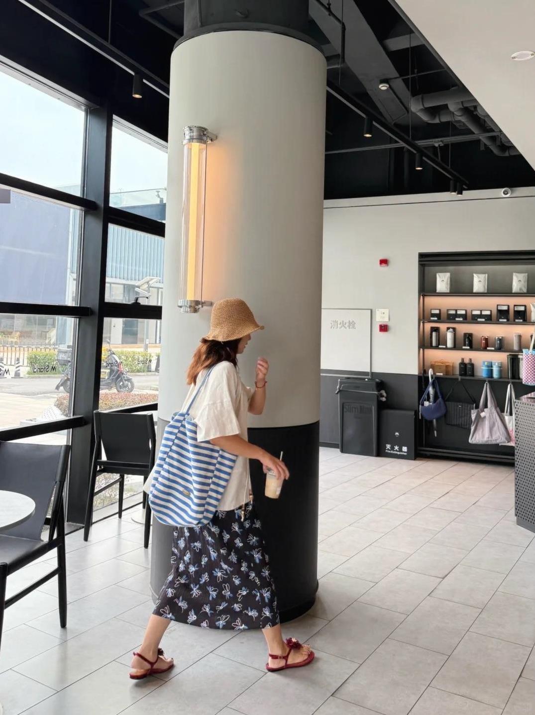 超爱这样的度假感松弛穿搭呀! 用宽松的白色上衣搭配藏蓝色碎花裙,清新又温柔。 博主的色彩组合也很惊艳,选择红色凉鞋带来明媚活力感,再加上蓝白条纹的帆布包,撞色组合清新减龄!