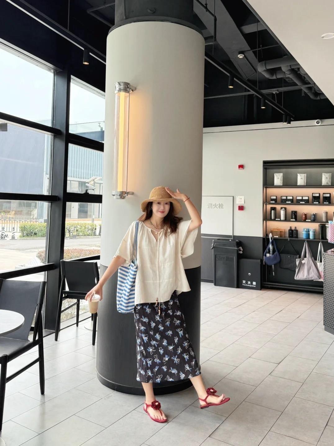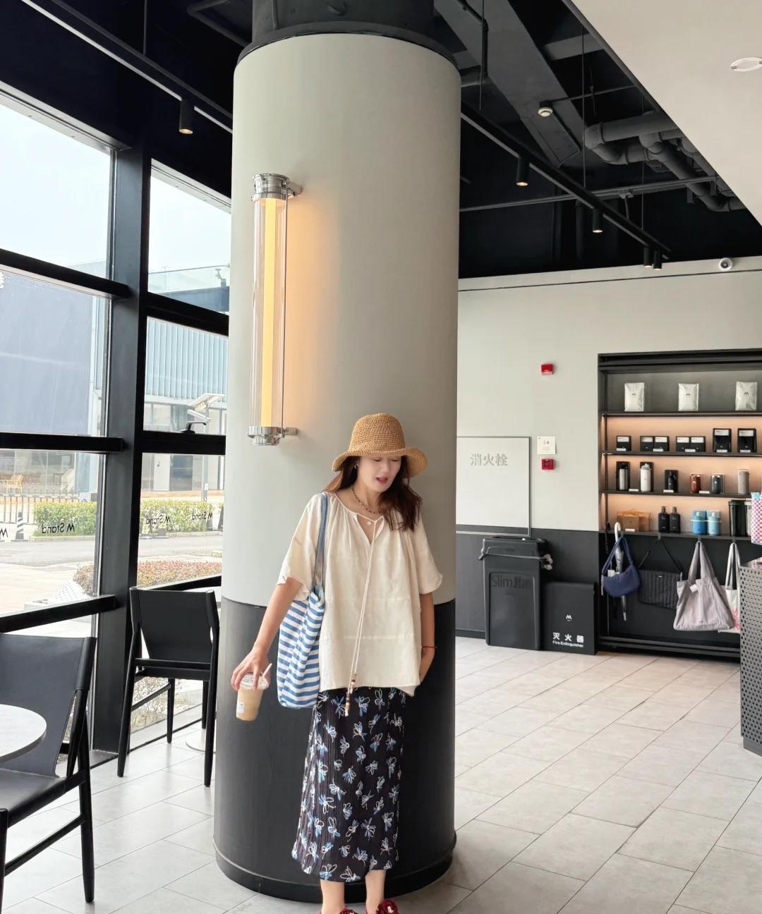 超爱这样的度假感松弛穿搭呀! 用宽松的白色上衣搭配藏蓝色碎花裙,清新又温柔。 博