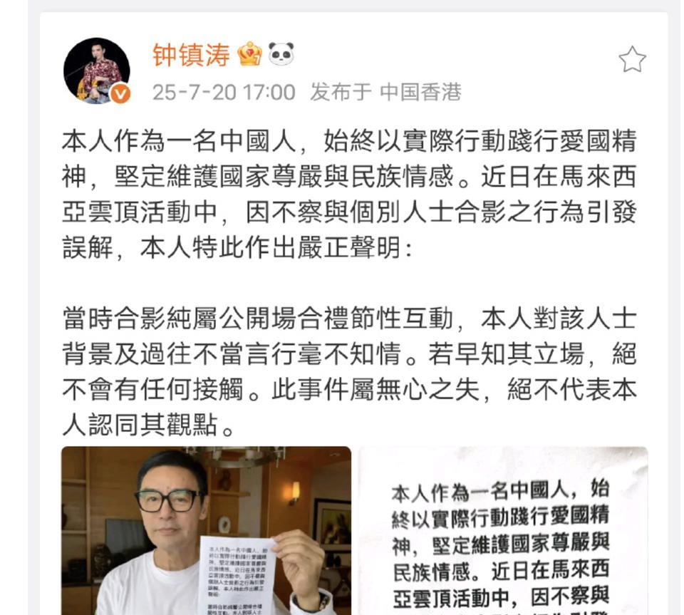 曾志伟和钟镇涛一起发表声明道歉。 原因是他们之前在马来西亚云顶的一场活动中,由于