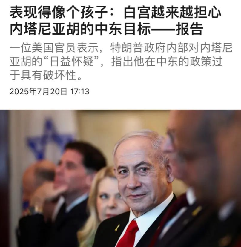 就在这当口,7月20日有消息传出,特朗普政府对内塔尼亚胡的政策及其本人愈发不满,这种态度相当罕见。