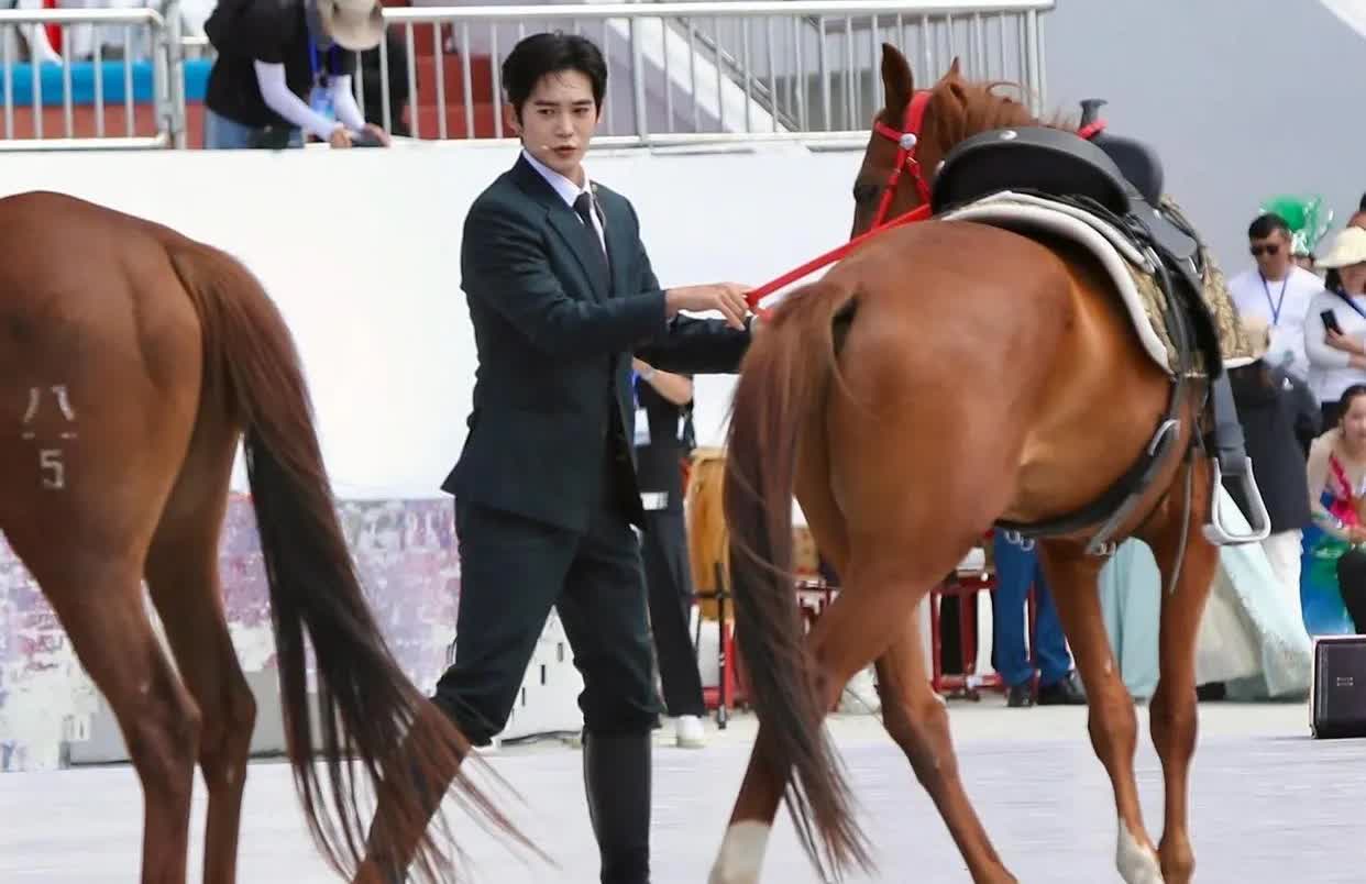 于适西装格里参加新疆天马节开幕式,西装骑马看着也太奇怪了吧,纤绳的时候好怕棕马看