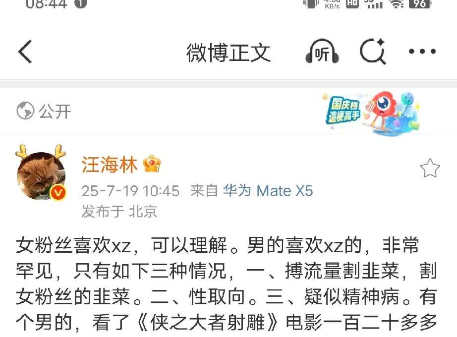 汪海林这嘴,被骂是一点不冤枉,瞅瞅这逆天发言,路过不骂一句感觉都对不起他。他说男粉喜欢男星就是不正常。 他发文说女粉丝喜欢男星很正常,但男粉丝喜欢就不正常。 还直接给喜欢的男粉分了三大类:要么是想割韭菜赚钱,要么是性取向特别,要么就是疑似精神病。 汪海林还举例,说有男观众把某电影刷了120多遍,暗指人家不正常。 结果网友笑了:追星自由懂不懂?有人爱看就多看几遍,咋还上升到人身攻击了? 更逗的是,他特意点名某个天天骂他的男大粉,说人家是三合一套餐——合着在他眼里,男粉不是图钱就是有病,这逻辑也是绝了。 说实话,明星粉丝男女都有,喜欢谁纯属个人爱好,非要贴标签反而显得狭隘。 汪海林这波操作,除了招骂,就剩招骂了。