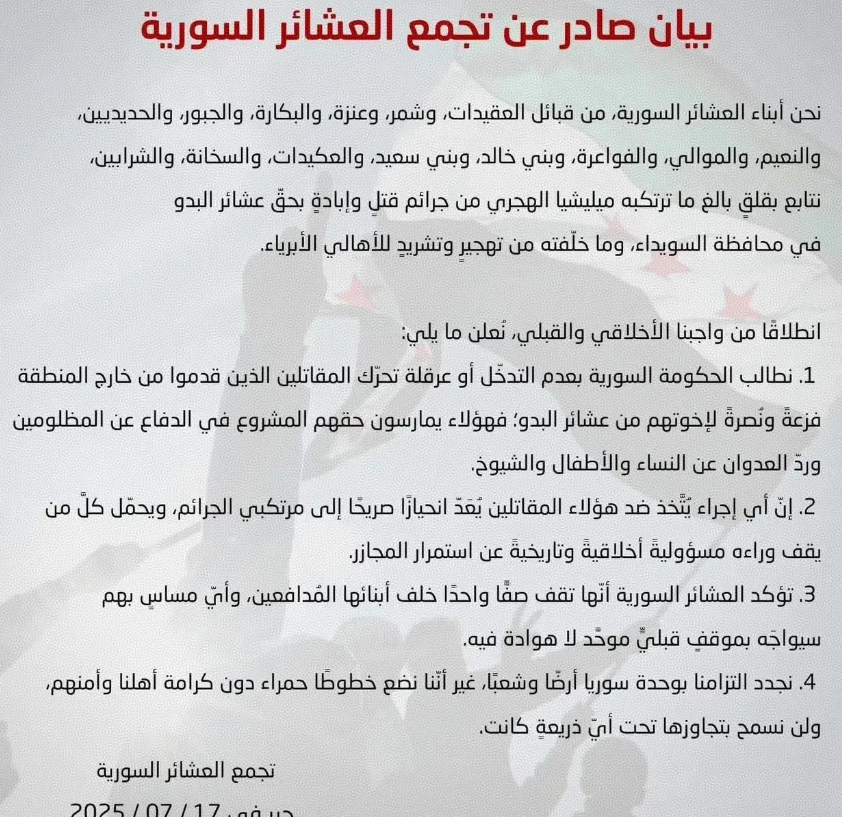 1.部落全面叛变:41个阿拉伯部落拒绝朱拉尼撤军令,7万武装扑向苏韦达省。卫星影像显示,17日深夜撤出该省的HTS主力竟调头回防,暴露朱拉尼对部族武装的操控彻底失效。