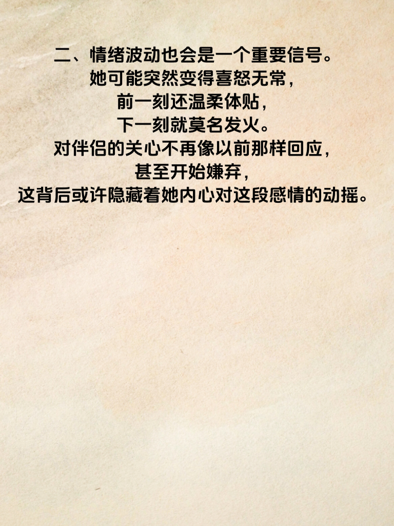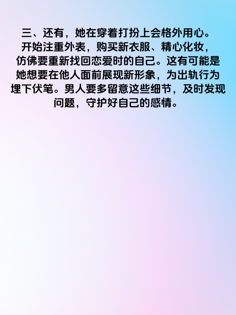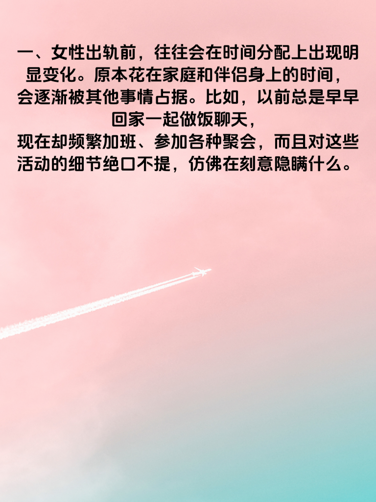 一、女性出轨前,往往会在时间分配上出现明显变化。原本花在家庭和伴侣身上的时间,会逐渐被其他事情占据。比如,以前总是早早回家一起做饭聊天,现在却频繁加班、参加各种聚会,而且对这些活动的细节绝口不提,仿佛在刻意隐瞒什么。 二、情绪波动也会是一个重要信号。她可能突然变得喜怒无常,前一刻还温柔体贴,下一刻就莫名发火。对伴侣的关心不再像以前那样回应,甚至开始嫌弃,这背后或许隐藏着她内心对这段感情的动摇。 三、还有,她在穿着打扮上会格外用心。开始注重外表,购买新衣服、精心化妆,仿佛要重新找回恋爱时的自己。这有可能是她想要在他人面前展现新形象,为出轨行为埋下伏笔。男人要多留意这些细节,及时发现问题,守护好自己的感情。