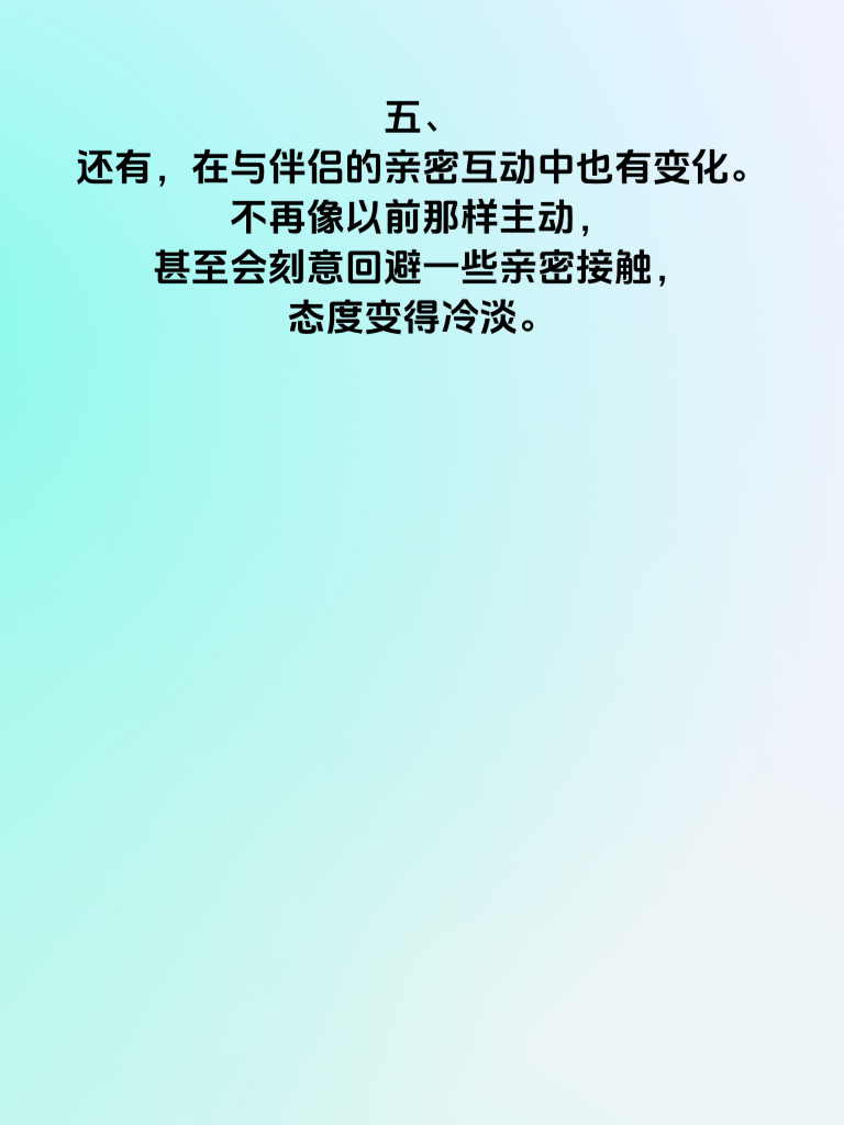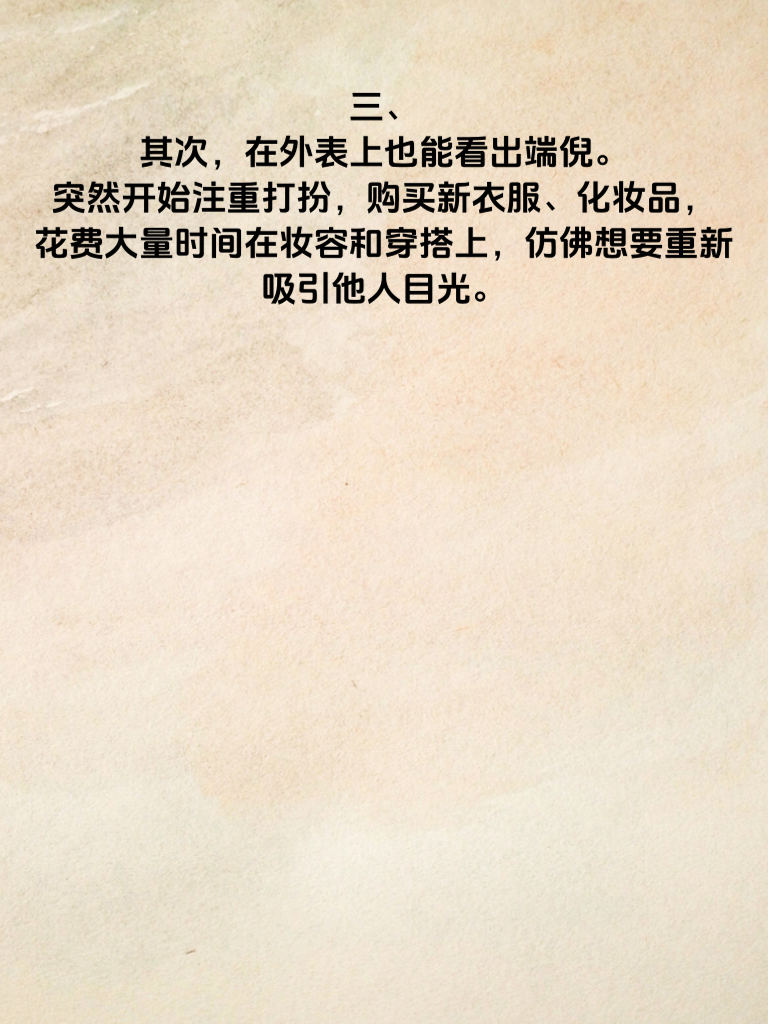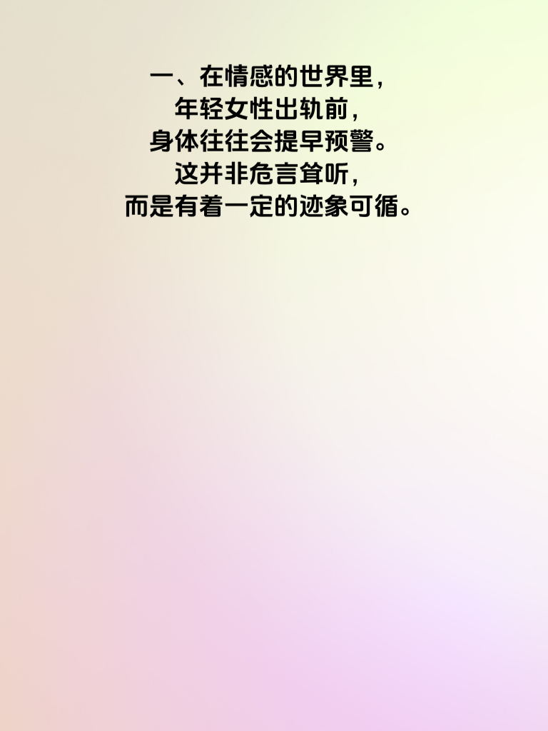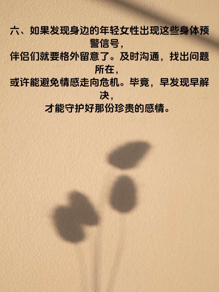 一、在情感的世界里,年轻女性出轨前,身体往往会提早预警。这并非危言耸听,而是有着一定的迹象可循。 二、首先,她们的日常行为会悄然改变。原本规律的生活作息变得混乱,开始频繁加班、应酬,回家时间越来越晚,对伴侣的关心也明显减少。 三、其次,在外表上也能看出端倪。突然开始注重打扮,购买新衣服、化妆品,花费大量时间在妆容和穿搭上,仿佛想要重新吸引他人目光。 四、再者,她们的情绪波动会加剧。时而莫名烦躁,对伴侣的一点小事就大发雷霆;时而又异常温柔,这种反差令人捉摸不透。 五、还有,在与伴侣的亲密互动中也有变化。不再像以前那样主动,甚至会刻意回避一些亲密接触,态度变得冷淡。 六、如果发现身边的年轻女性出现这些身体预警信号,伴侣们就要格外留意了。及时沟通,找出问题所在,或许能避免情感走向危机。毕竟,早发现早解决,才能守护好那份珍贵的感情。