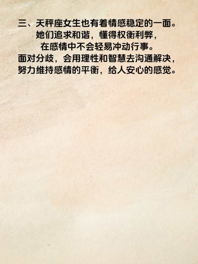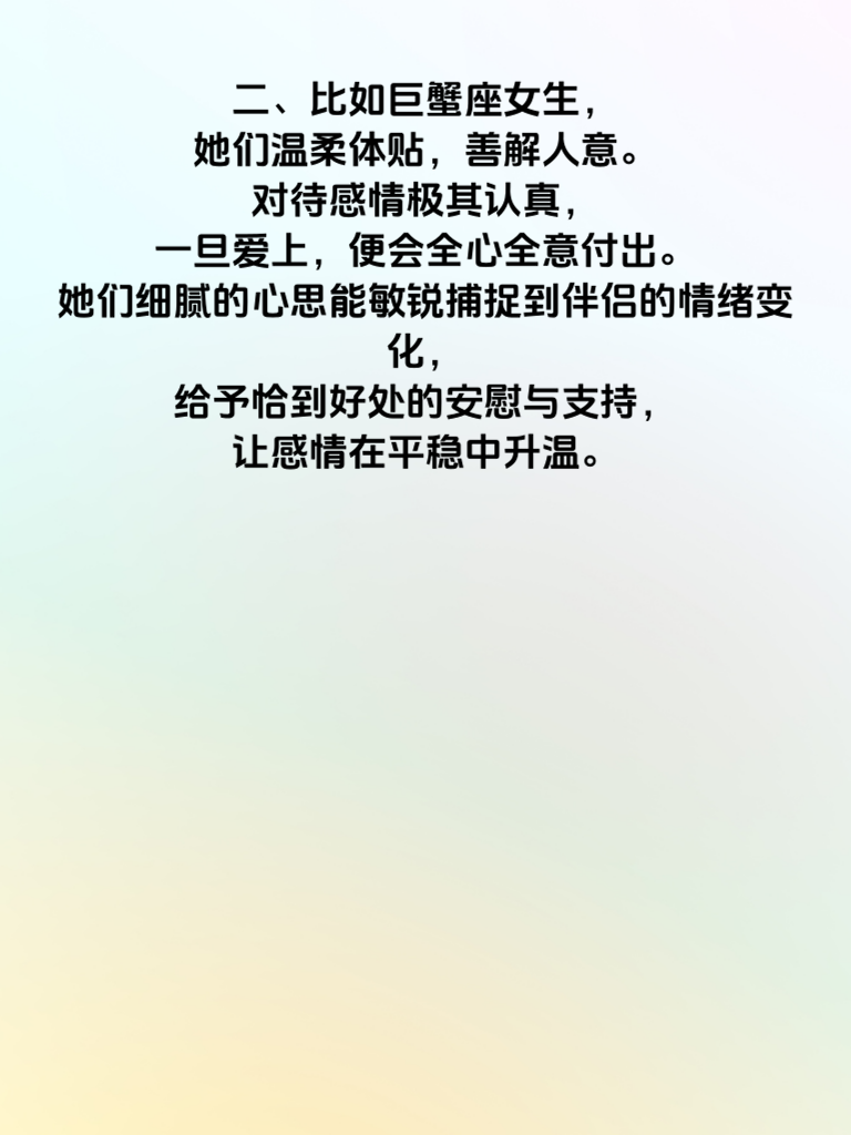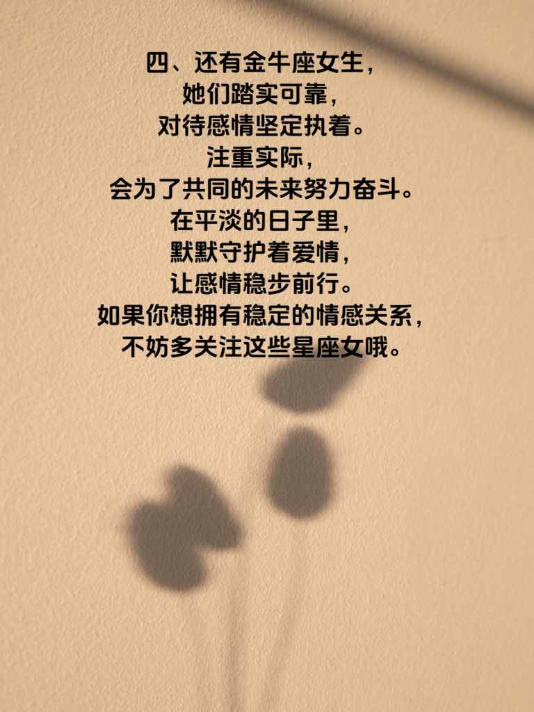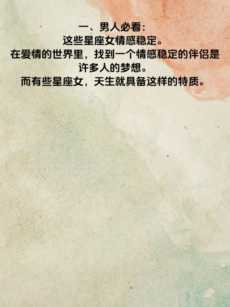 一、男人必看:这些星座女情感稳定。在爱情的世界里,找到一个情感稳定的伴侣是许多人的梦想。而有些星座女,天生就具备这样的特质。 二、比如巨蟹座女生,她们温柔体贴,善解人意。对待感情极其认真,一旦爱上,便会全心全意付出。她们细腻的心思能敏锐捕捉到伴侣的情绪变化,给予恰到好处的安慰与支持,让感情在平稳中升温。 三、天秤座女生也有着情感稳定的一面。她们追求和谐,懂得权衡利弊,在感情中不会轻易冲动行事。面对分歧,会用理性和智慧去沟通解决,努力维持感情的平衡,给人安心的感觉。 四、还有金牛座女生,她们踏实可靠,对待感情坚定执着。注重实际,会为了共同的未来努力奋斗。在平淡的日子里,默默守护着爱情,让感情稳步前行。如果你想拥有稳定的情感关系,不妨多关注这些星座女哦。