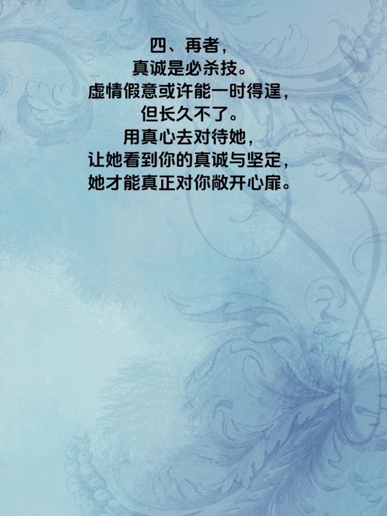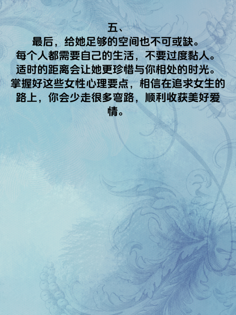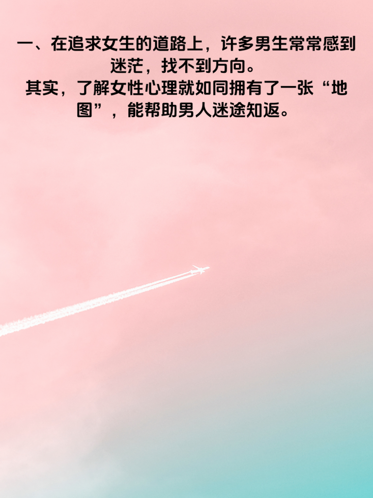 一、在追求女生的道路上,许多男生常常感到迷茫,找不到方向。其实,了解女性心理就如同拥有了一张“地图”,能帮助男人迷途知返。 二、首先,要明白女生大多注重细节。一句贴心的问候、一个温暖的举动,都可能走进她的心里。比如在她疲惫时递上一杯热茶,在她生病时细心照顾,这些细节能让她感受到你的关怀。 三、其次,尊重她的想法和选择至关重要。不要强行把自己的观点加给她,认真倾听她的意见,让她觉得自己是被尊重和平等对待的。 四、再者,真诚是必杀技。虚情假意或许能一时得逞,但长久不了。用真心去对待她,让她看到你的真诚与坚定,她才能真正对你敞开心扉。 五、最后,给她足够的空间也不可或缺。每个人都需要自己的生活,不要过度黏人。适时的距离会让她更珍惜与你相处的时光。掌握好这些女性心理要点,相信在追求女生的路上,你会少走很多弯路,顺利收获美好爱情。