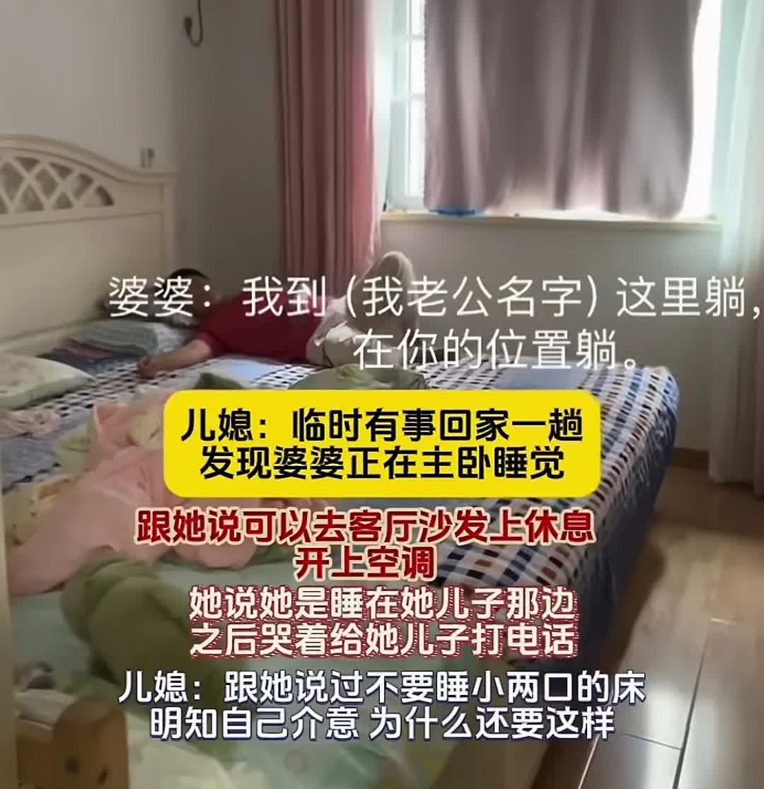 婆婆躺在儿媳的床上休息对不对?湖北一女子临时有事回家一趟,发现婆婆又躺在自己的床上!女子问婆婆为什么不躺在沙发上,非要躺在他们的床上?婆婆说她在他儿子的位置躺着,没在儿媳的位置躺!还哭着给儿子打电话,说儿媳欺负她!遇到这样的婆婆,儿媳也是无语!