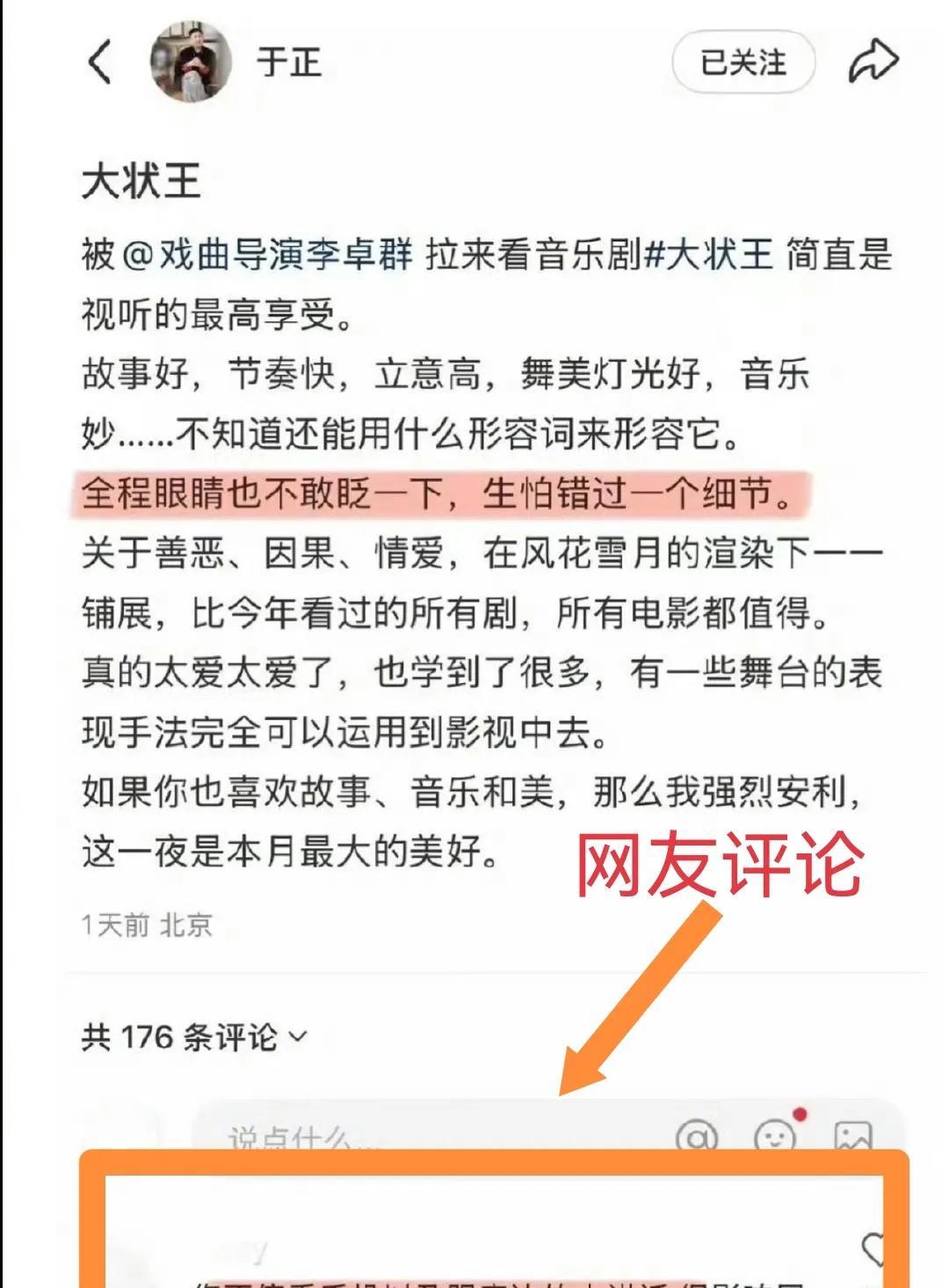 哈哈哈,于正太能装了,关键每次装都被网友拆穿了,啪啪啪的打脸,这才是重点。 最近于正说他去看音乐剧,真的很精彩,都不敢眨眼睛,生怕错过每一个细节,谁知道一个网友在底下评论说:你在旁边一直看手机,还和身边的人说话,真的很影响别人啊,下次别这样做了,谁知道于正啥也没辩解,竟然默默的删除了这个评论哈哈哈。 估计于正也没想到会有和他一起看音乐剧的网友啊,没想到这个网友就这样揭穿了他。 其实自从于正说了“骗你了,怎么了?”之后,我觉得于正这个人的话真的不能听,他嘴里的话,估计没几句是实话的哈哈哈。 作为一个导演,经常出来丢丢脸,也算是给自己来点流量了,其实说不定这就是他想要的呢。