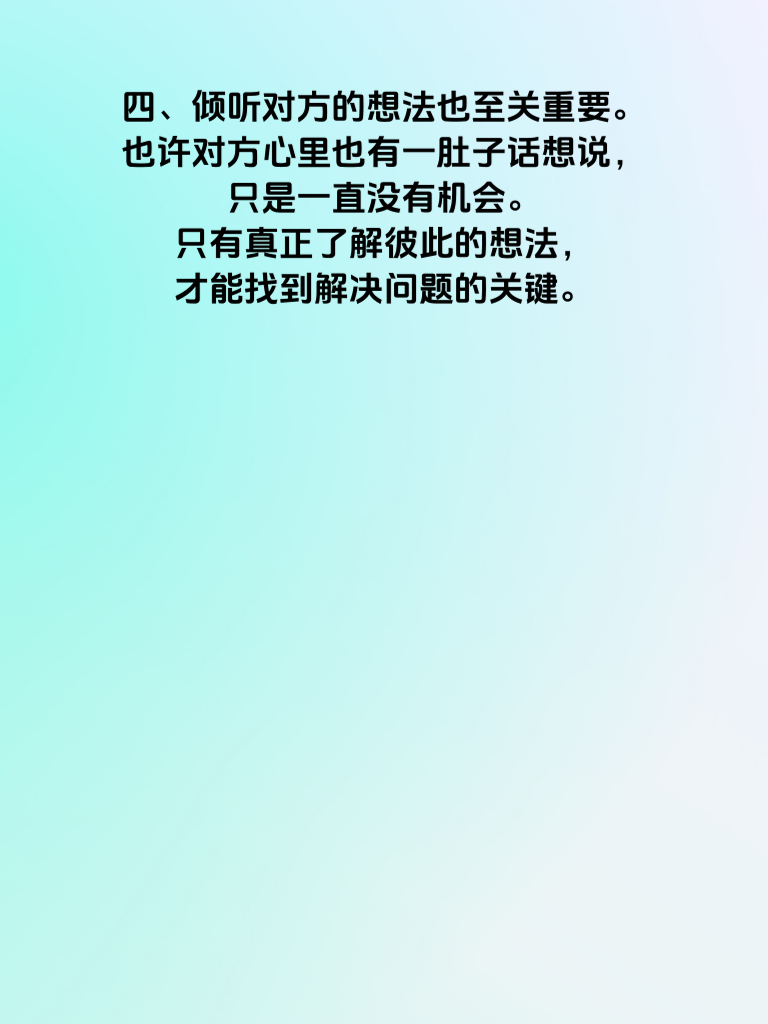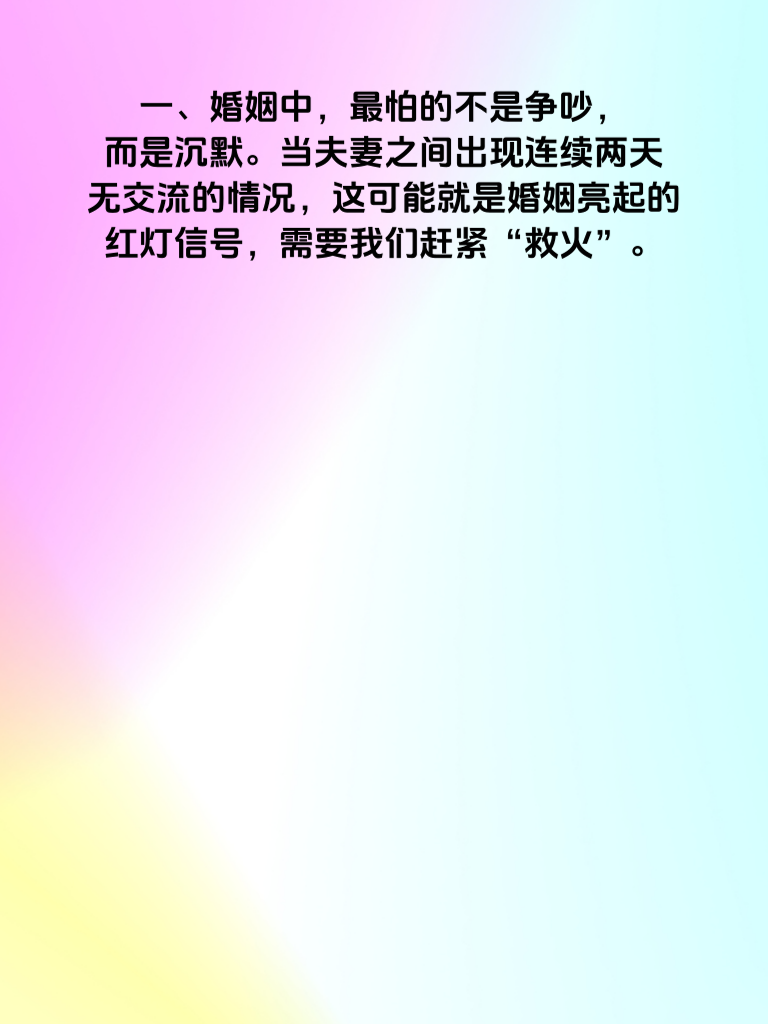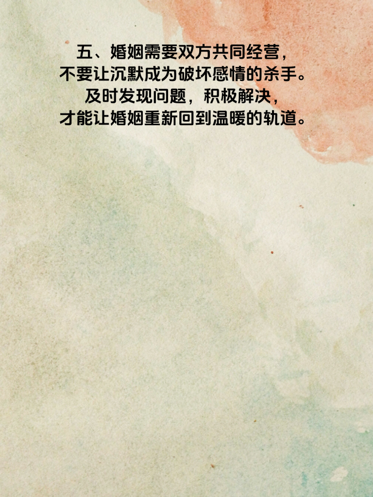 一、婚姻中,最怕的不是争吵,而是沉默。当夫妻之间出现连续两天无交流的情况,这可能就是婚姻亮起的红灯信号,需要我们赶紧“救火”。 二、这种长时间的不交流,往往会让彼此的心渐渐疏远。它可能源于生活琐事的积累,让双方都疲惫不堪,不知如何开口;也可能是矛盾的不断升级,导致两人都在气头上,谁也不愿意先打破沉默。 三、想要解决这个问题,首先要主动迈出第一步。找一个合适的时机,心平气和地和对方沟通,表达自己对这段沉默期的感受和担忧。 四、倾听对方的想法也至关重要。也许对方心里也有一肚子话想说,只是一直没有机会。只有真正了解彼此的想法,才能找到解决问题的关键。 五、婚姻需要双方共同经营,不要让沉默成为破坏感情的杀手。及时发现问题,积极解决,才能让婚姻重新回到温暖的轨道。