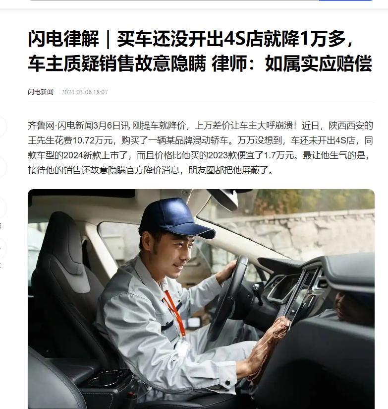 “吃相太难看!”陕西西安,一男子花费10.72万元,购买了一辆吉利的混动轿车。万万没想到,车辆还未开出4S店,官方就降价1.7万元,导致男子直接亏损1万多元。男子表示,销售故意隐瞒了信息,屏蔽了朋友圈,导致自己对降价的消息一无所知。 在陕西西安,买辆新车本该是件开心事,可王先生却摊上了糟心事。他花10.72万元买了辆吉利混动轿车,车还没开出4S店,官方就宣布降价1.7万元,直接让他亏了一万多。王先生气得直跳脚,觉得销售故意藏着掖着,还把他拉黑了朋友圈,害他一点风声都没听到。这事一曝光,网上炸开了锅,网友们吵得不可开交。这到底是4S店套路深,还是买车时机不对?真相如何,值得一探究竟。 王先生,35岁,家住西安雁塔区,是一家物流公司的中层管理人员。他每天忙着协调货运,收入还算稳定,养着老婆和三岁的小女孩。家里那辆开了十年的老轿车早就问题频出,修车钱花了不少,油耗也高得离谱。王先生盘算着换辆省油的车,混动车成了首选。他花了好几个月,跑遍了西安的4S店,网上查资料、看测评,笔记本上记满了车型对比。 吉利银河L6让他眼前一亮,设计时尚,价格也合适,官方报价13.28万元。他跟老婆商量了好几轮,觉得这车靠谱,能省油又不贵。跑了好几次吉利银河西安国利体验中心,试驾、问价,货比三家后,他下定决心要买这辆车。为了省钱,他还特意挑了个工作日去谈价格,希望能砍点价下来。 3月1日那天,王先生走进4S店,跟销售员李某磨了两个多小时,终于把裸车价砍到10.72万元。他付了3.2万元首付,办了8万元无息贷款,分期每月还3300元。下午4点半,他签了合同,5点半搞定贷款手续,7点钟把车开回了家。开着新车,他满心欢喜,觉得这钱花得值。 可到了晚上8点多,他在手机上刷到一条消息,吉利官方下午3点开了发布会,2024款银河L6上市,价格直接降到10.58万元,比他买的便宜1.7万元。新款还有升级的电池和中控屏,性能更好。王先生傻眼了,赶紧去看销售员的朋友圈,发现自己被拉黑了,根本看不到李某6点52发的关于新款的消息。他气得不行,觉得销售明知降价却啥也没说,摆明是坑人。 第二天一早,王先生杀回4S店,找销售员李某对质。李某推说自己朋友圈对所有客户都屏蔽了,不是针对他。市场总监张某出面解释,说厂家3点多发的消息,他们4点多开票时真不知道,存在个时间差,是跟厂家的沟通出了问题。王先生不买账,觉得4S店干这行这么久,哪可能对降价一无所知。他当场拍了视频,怒气冲冲地把这事发到网上,立马引来一大堆人围观。 视频里,他讲了自己买车的经过,控诉4S店不地道。网上很快炸了锅,有人骂4S店吃相太难看,觉得专业卖车的怎么可能不知道降价的事;也有人说,降价是市场常态,买车看运气,涨价了王先生会去补差价吗?还有人扒出其他4S店当天下午就发了新款消息,质疑国利体验中心装傻。 这事闹得沸沸扬扬,网上讨论越来越热,#新车没开出4S店就降价1.7万#的标签都上了热搜。王先生查了更多资料,发现新款银河L6的电池续航多了20公里,中控屏也升级了语音交互,功能比他买的老款强不少。这让他更来气,觉得自己不光亏了钱,还买了个过时货。 他几次跑到4S店,要求退1.7万元差价或者换新款配置。张某每次都赔笑脸,说会跟厂家反映,争取给个满意的方案。可过了好几天,4S店还是没给准信,只说厂家还在研究。王先生又去问了几次,每次都得到差不多的答复。他还查了法律条款,想看看能不能讨个公道。网上有律师分析,民法典第595条讲得很清楚,买卖合同签了就生效,厂家降价不影响合同效力。第151条虽然说可以撤销不公平的合同,但王先生没证据证明4S店故意瞒信息。律师还指出,降价是公开消息,4S店没义务特意通知客户。虽然4S店不厚道,但法律上站不住脚。 到了3月中旬,吉利总部终于给了回复,提出给王先生5000元的售后服务抵用券,可以用来保养或者买配件。王先生虽然不甘心,但也知道打官司费时费力,胜算不大,只能捏着鼻子接受了。这事让他对买车这行当彻底寒了心,觉得4S店和厂家玩套路,消费者根本防不住。他后来跟朋友说,以后再买车,得盯着官方消息,签合同前多问几家,免得又踩坑。 这辆银河L6他还得继续开,每月还着3300元的贷款,车虽好开,但总觉得有点别扭。网上讨论渐渐平息,有人同情王先生,觉得他运气太背;也有人觉得他反应过激,买车哪有不降价的。这事最后不了了之,但王先生的故事提醒了不少人,买车得擦亮眼,别光听销售忽悠。 这事咋看?王先生亏了1.7万,确实让人窝火,可4S店说不知道降价,你信吗?降价是市场规律,但这么大的价差,换谁不心疼?欢迎留言说说你的看法,买车时遇到过啥坑?