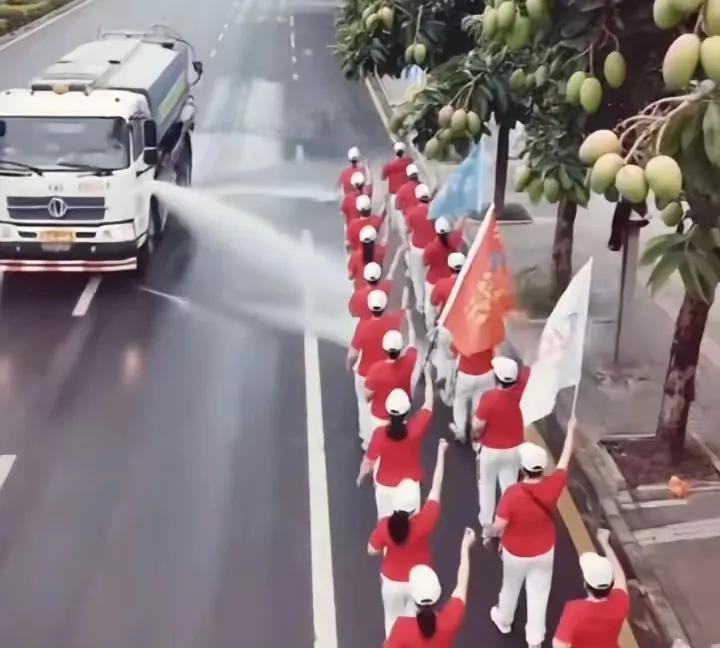 取缔暴走团占道的办法终于找到了!一群大爷大妈整齐划一正在街道上暴走,这时一辆环卫洒水车也由远处正朝他们慢慢驶过来,一边行驶一边洒水,可是他们见了洒水车居然躲也不躲,估计这些人从头到尾的衣服都湿透了!关键是他们即使被水柱打湿了衣服,队形也没乱,佩服!佩服!看来洒水车及时出现就能很好地解决这个“暴走团”的顽疾!这个办法绝对可以在各个城市普及!因为这些大爷大妈们知道警察奈何不了,这岁数了你还不能抓。所以请市政城管、公安等多部门联合,发现暴走占道的就用洒水车驱离!