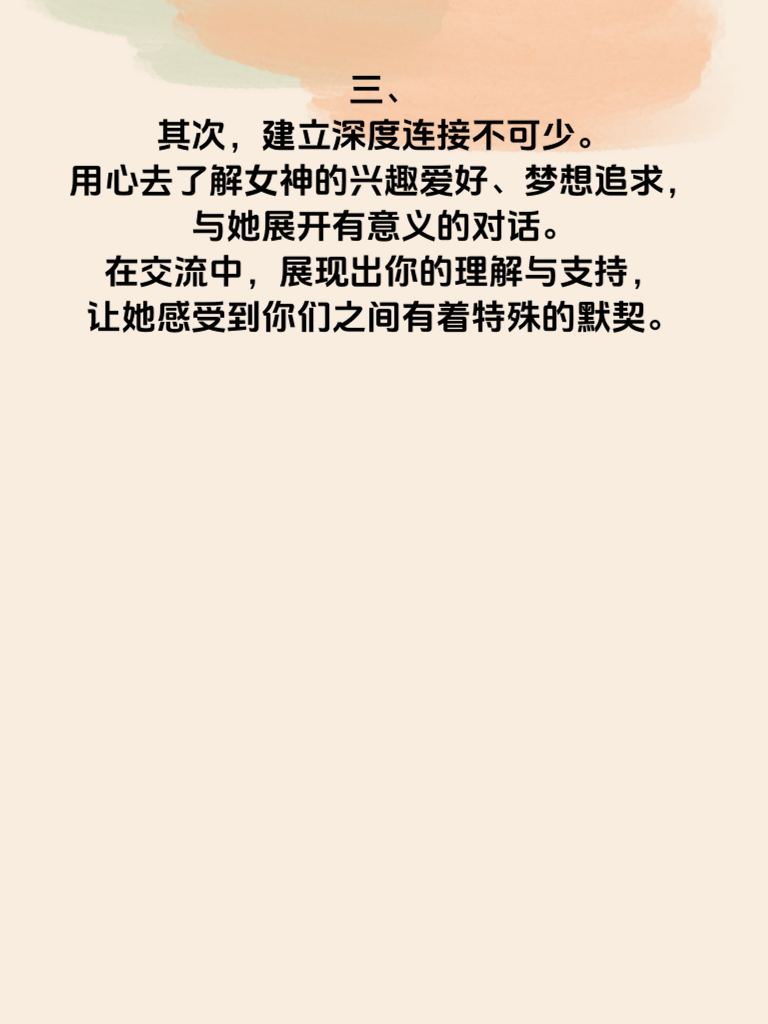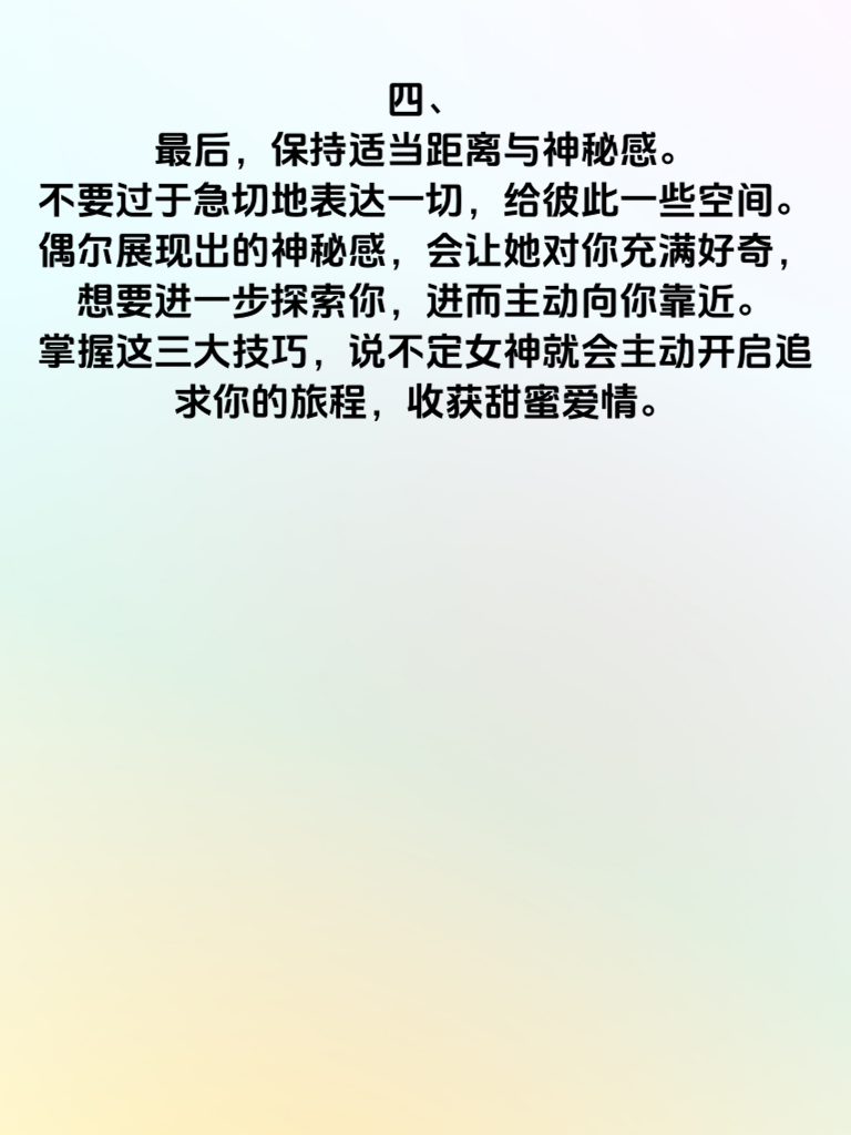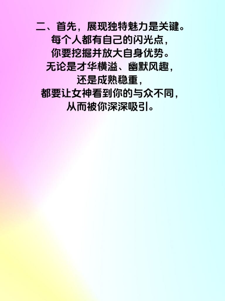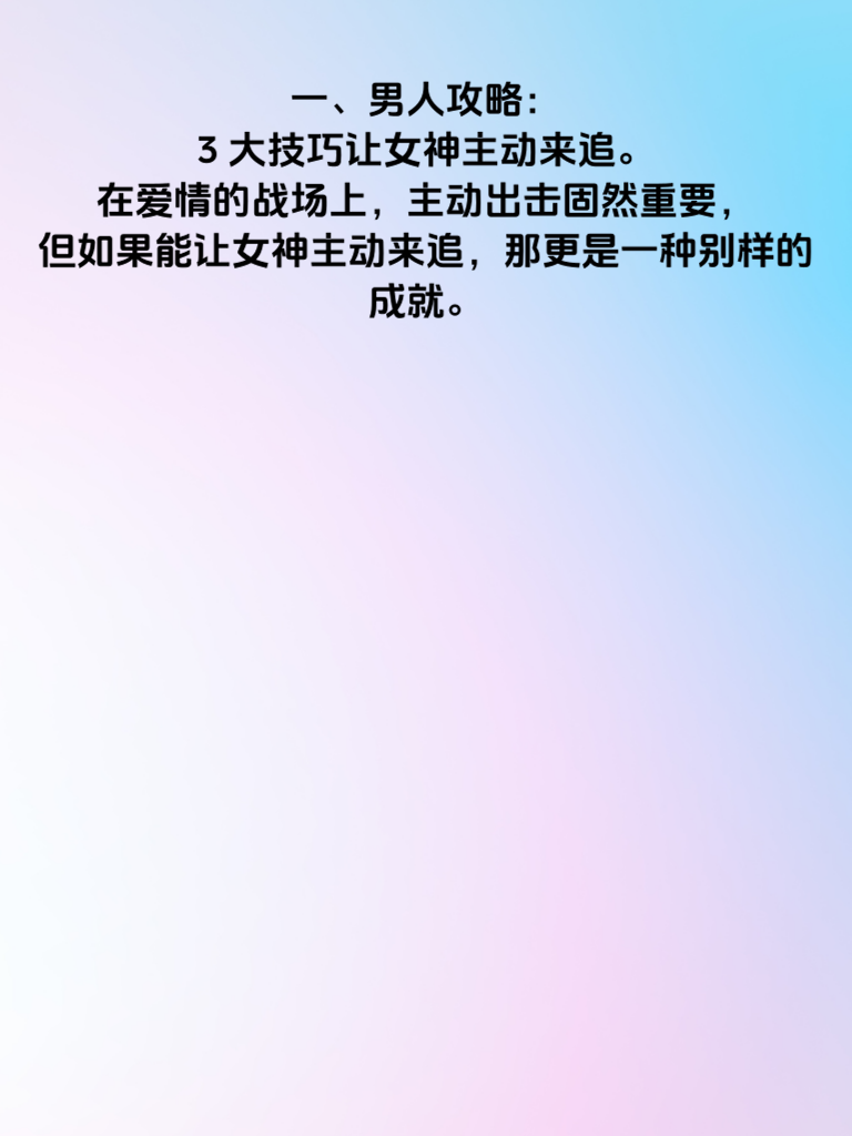 一、男人攻略:3 大技巧让女神主动来追。在爱情的战场上,主动出击固然重要,但如果能让女神主动来追,那更是一种别样的成就。 二、首先,展现独特魅力是关键。每个人都有自己的闪光点,你要挖掘并放大自身优势。无论是才华横溢、幽默风趣,还是成熟稳重,都要让女神看到你的与众不同,从而被你深深吸引。 三、其次,建立深度连接不可少。用心去了解女神的兴趣爱好、梦想追求,与她展开有意义的对话。在交流中,展现出你的理解与支持,让她感受到你们之间有着特殊的默契。 四、最后,保持适当距离与神秘感。不要过于急切地表达一切,给彼此一些空间。偶尔展现出的神秘感,会让她对你充满好奇,想要进一步探索你,进而主动向你靠近。掌握这三大技巧,说不定女神就会主动开启追求你的旅程,收获甜蜜爱情。