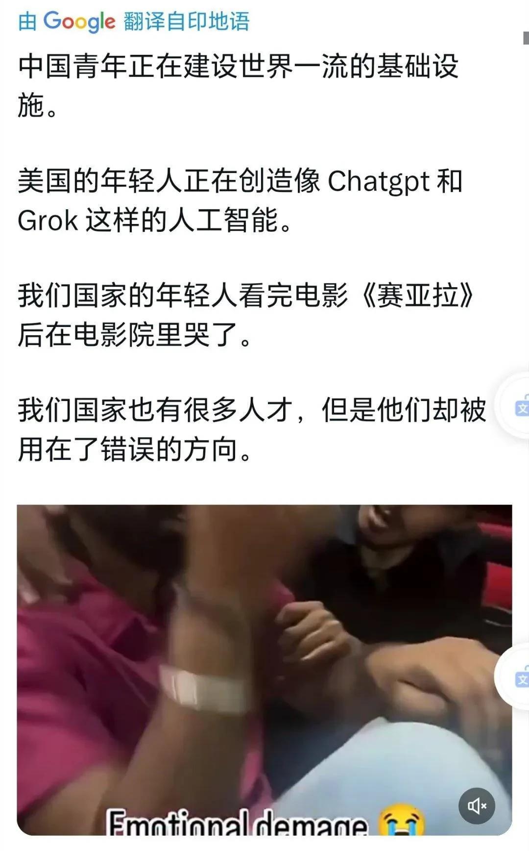 一部电影让印度年轻人反思!为何其它国家年轻人都在努力奋斗,而印度年轻人却还在哭哭啼啼! 消息来源:国外社交平台 近日一部印度本土电影《赛亚拉》在当地爆火,它是一部讲述印度年轻人的爱情电影,类似西方的“罗密欧与朱丽叶”,但内容中添加了印度本土元素,也可以说是一部关于印度种姓制度不平等的恋爱电影!(高种姓爱上了低种姓) 每次这部电影散场都能看到印度年轻人哭的稀里哗啦! 对此情景有印度人发帖提出了反思:当中国年轻人正在建设世界一流的基础设施,美国年轻人正在创造高科技的人工智能,而我们的年轻人却在电影院哭的稀里哗啦!我们有很多人才,但他们用在了错误的方向! 原来印度也不只是需要赢学,有时候也需要反思!可惜赢学的人多,反思的人少!