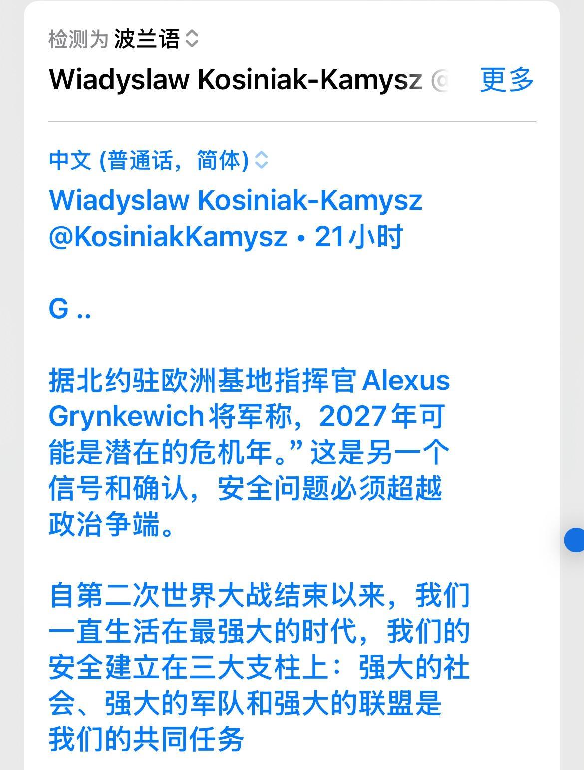 波兰妄想症,最危险的时代即将来临! 波兰副总理兼国防部长科西尼亚克-卡梅什表示,俄国与中国可能发动进攻,2027年或成全球安全局势转折点。 科西尼亚克 - 卡梅什(Kosiniak-Kamysz)支持北约欧洲部队司令亚历克苏斯·格林克维奇(Alexus Grynkewich)将军的预测,即未来1.5至2年内,有可能爆发由中国和俄罗斯参与的大型武装冲突。 科西尼亚克 - 卡梅什认为,欧洲和美国必须立即调动资源,为“二战以来最危险的时期”做好准备。 自俄乌冲突爆发后,波兰向乌克兰方面提供了大量武器和物资。波兰国防部长不止一次指出,波兰不排除与俄罗斯发生战争的可能性,波兰必须为这样的战争做好准备。 波兰的如意算盘打的挺好。认为现在是俄罗斯在历史上最虚弱的时候,波兰可以借助北约之手完成从未完成的任务,把俄罗斯彻底打败,甚至肢解俄罗斯,永绝后患。 虽然波兰的军事实力很强,虽然波兰是北约成员国,但如果波兰一意孤行的想与俄罗斯爆发冲突,其后果还是非常严重的。 波兰应该从历史上四次被灭国中吸取教训,不要轻易招惹俄罗斯,否则一旦与俄罗斯爆发冲突,波兰的下场不会好于俄罗斯,波兰应该记住历史教训,避免战争!