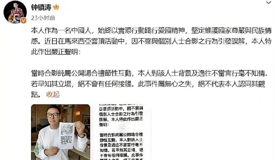 曾志伟因与争议人物合影引发风波,7月21日凌晨正式发声澄清。 7月21日凌晨,曾志伟通过社交媒体发布声明,针对近日因与一位争议人物合影而引发的公众误解进行澄清。他在声明中强调,此次合影仅出于公开场合的礼节性互动,并非对对方观点的支持或认同。曾志伟表示,自己并不了解该人士的背景及其过往行为,若提前得知相关情况绝不会与其接触,此次事件纯属无意失误。他深感遗憾并向公众致以诚挚歉意。这一事件不仅反映了娱乐圈内部的复杂关系,也引发了公众对于明星社会责任的讨论。#曾志伟明星照# #怀集曾志伟# #曾志伟潮州话#