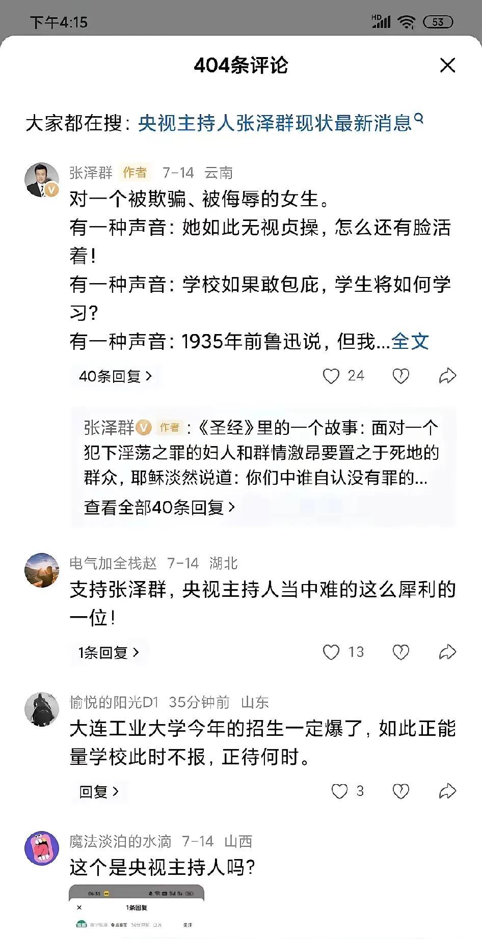张泽群生气了? 怎么感觉他说的话怪怪的。 是什么原因导致他如此愤怒? 为了教育大众,他连圣经都引用上了。 看来张泽群是大爱啊。 张泽群敢于公开发言,肯定有站住脚的价值观和判断标准。 大连工业大学的这个女孩,真是引起了“诸子讨论”“百家争鸣”。 大连工业大学的这个女孩,绝不是第一例,也绝不是最后一例。 现在讨论激烈也是好事。以后大家再遇到这种事情,就有经验了。