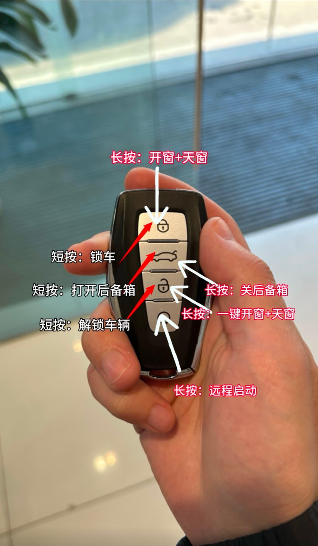 1. 车窗与空调联动开启:长按解锁键,四个车窗自动打开,同时车内空调启动换气,解决夏日车辆暴晒后车内高温问题(实测暴晒后车内超70℃)。 2. 寻车模式:短按解锁键两次,车辆开启寻车模式,方便地库等场景快速找车。 3. 后备箱自动控制:长按后备箱开锁键,后备箱自动打开;再次长按则自动关闭,适用于购物后双手持物时操作。 4. 远程启动与熄火:按一下解锁键后长按第四个键,实现车辆远程启动;短按第四个键两次可远程熄火