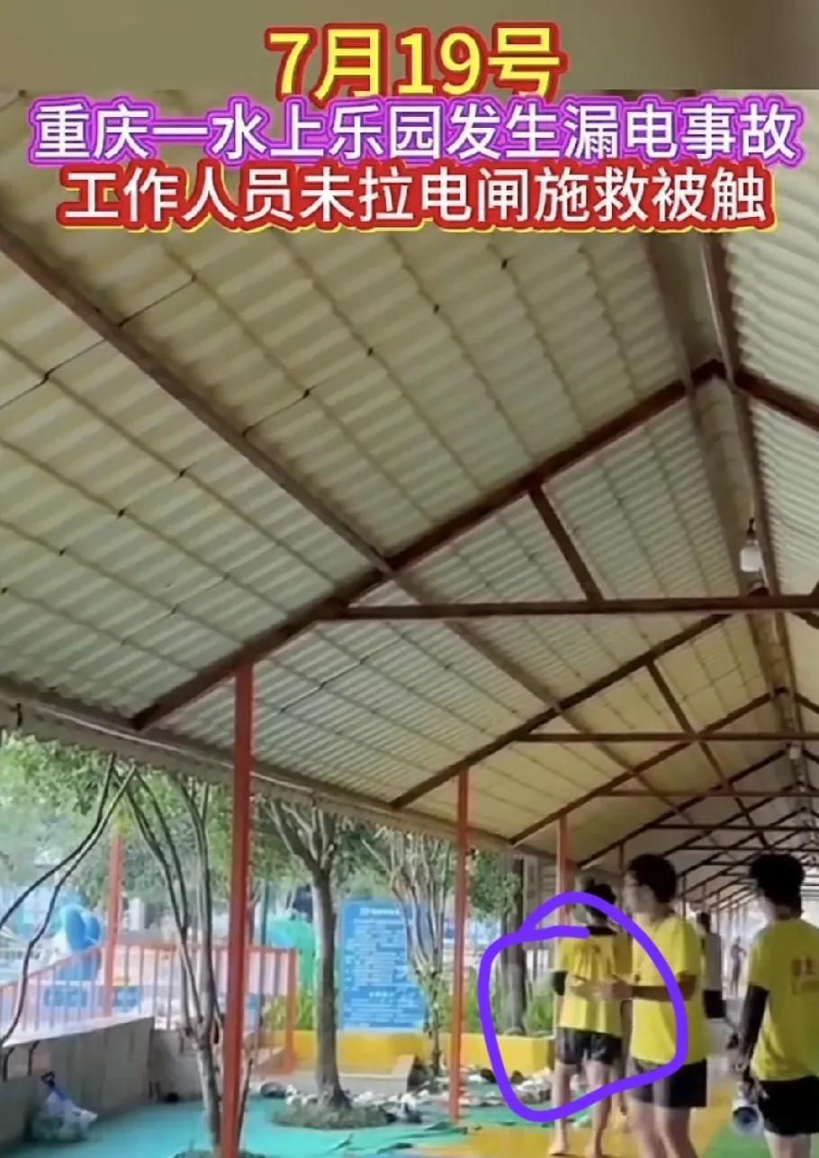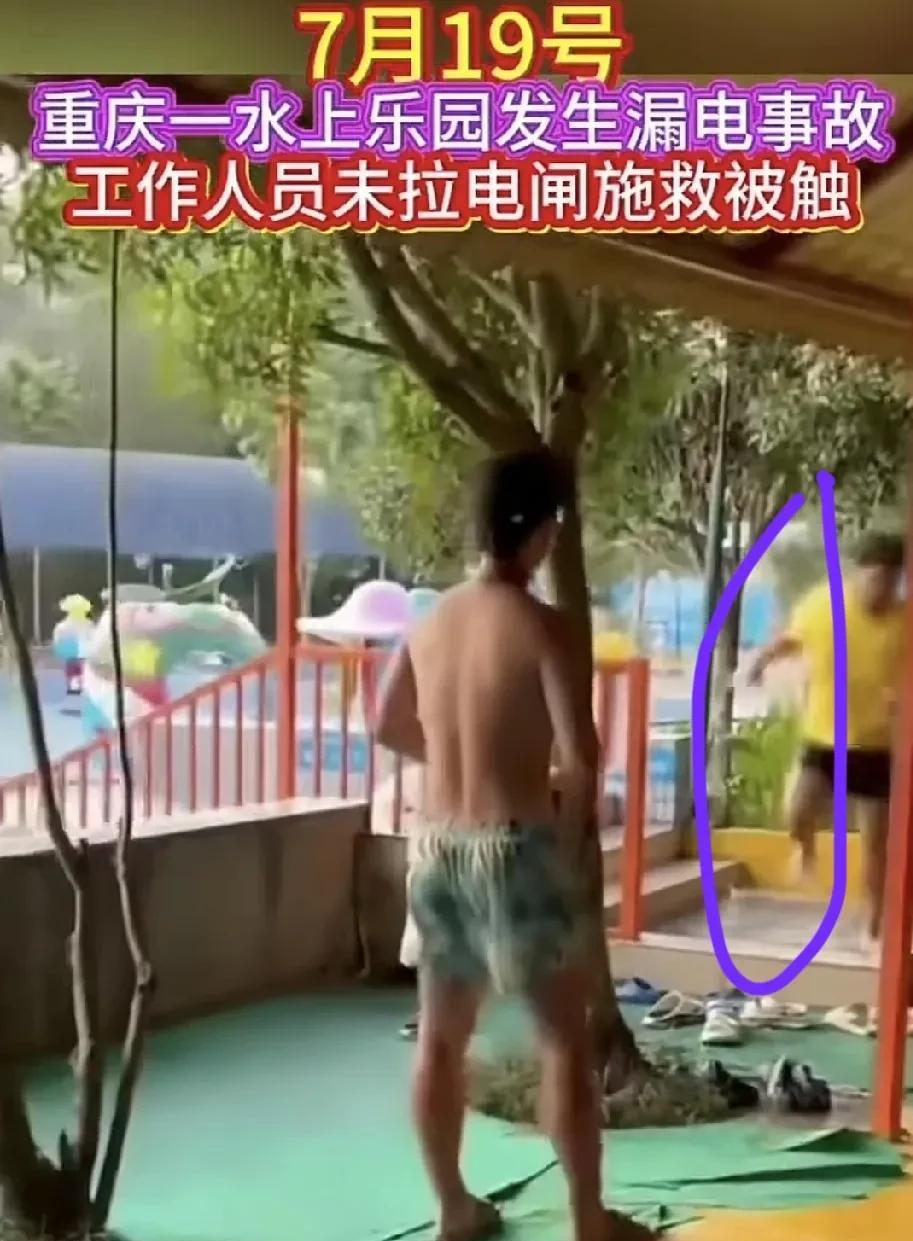 网传重庆i某水上乐园发生漏电事故的视频,视频里有个小孩被电击倒在台阶上,现场工作