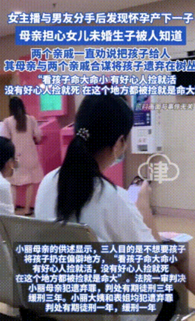 不过得到了孩子生母的谅解之后,女子母亲遗弃罪判刑3年,缓刑3年,而其他两个亲戚,则是判刑1年缓刑1年处理,算是给她们一些教训。