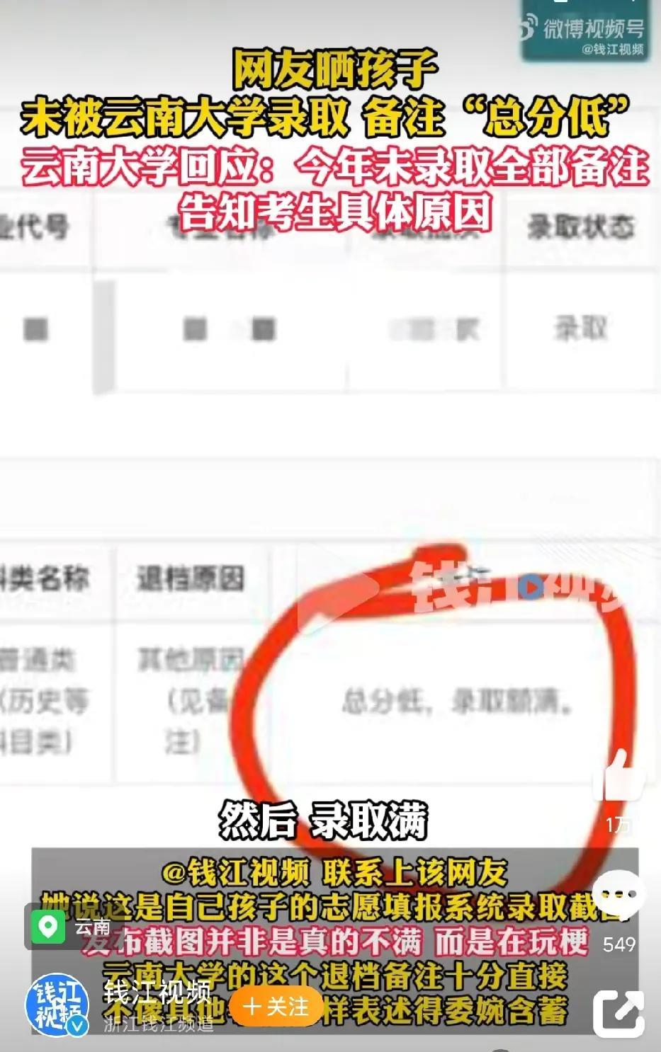 云南大学的这个操作,加上考生家长的相互配合,直接将喜剧感拉满! 一位网友晒出一张孩子未被云南大学录取的截图,图中显示该校备注她的孩子未被录取的原因是“总分低,录取额满”。 对此,网友感觉被云南大学“羞辱”了!她称“云南大学,不要我就不要我,何苦要加这几个字,羞辱本宫!” 对此,云南大学回应称,加这几个字的原因,目的就是为了让考生能直观了解自己未被录取的原因,此外没有其他含义。 有网友支持学校的做法,认为这种方式直接了当,省去了不应有的争议和麻烦。 也有网友认为,学校还可以表达得含蓄一点,“总分低”这三个字确实太扎心,学校也应该考虑一下考生的感受,措词上再委婉一些会更暖心。 各位如何看云南大学的这个操作?