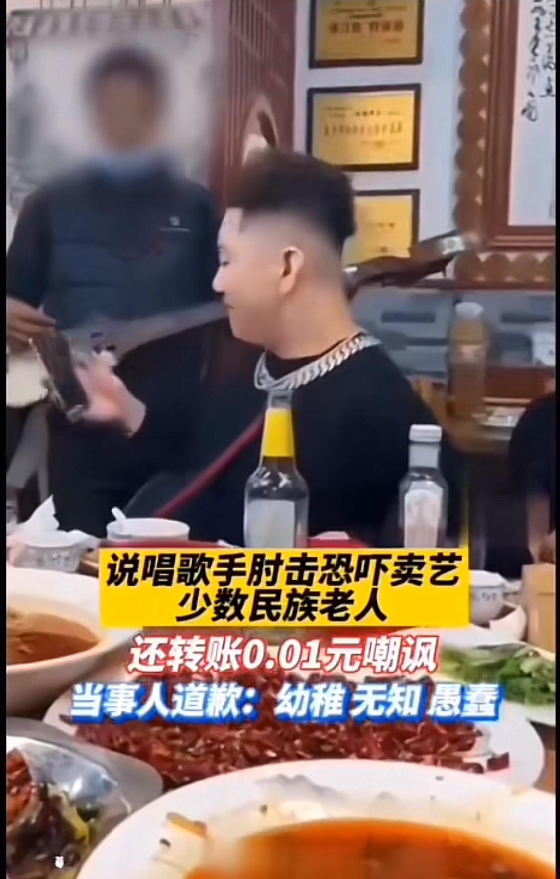 近日,在成都一餐馆,一名说唱歌手在就餐时让少数民族老艺人表演才艺,期间故意用肘击