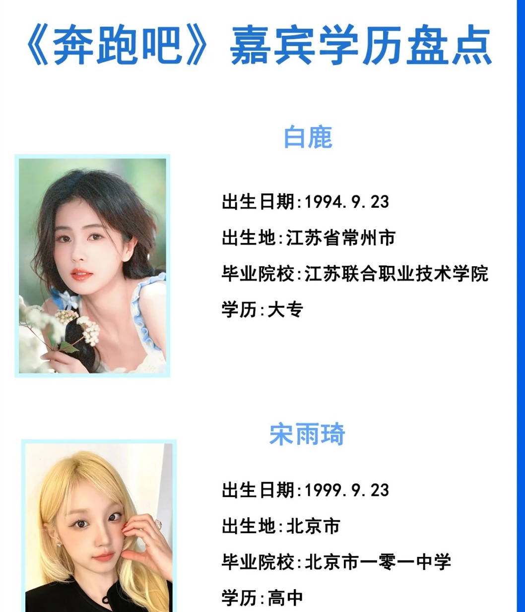 追《奔跑吧》才发现!嘉宾学历差别? 学历多元型选手 周深是利沃夫国立音乐科学院本科,张真源中戏本科、沙溢军艺本科、郑恺上戏本科 ,专业院校出身自带buff,舞台和综艺里的表现,果然藏着功底! 学历“不走寻常路”型 白鹿是江苏联合职业技术学院大专,宋雨琦、范丞丞高中学历,李晨是中专~ 但学历没拦住他们发光!综艺里的感染力、作品里的爆发力,照样圈粉无数! 不管是走专业院校路线,还是从实践里摸爬滚打,能在自己领域闪闪发光的,都是最好的自己。