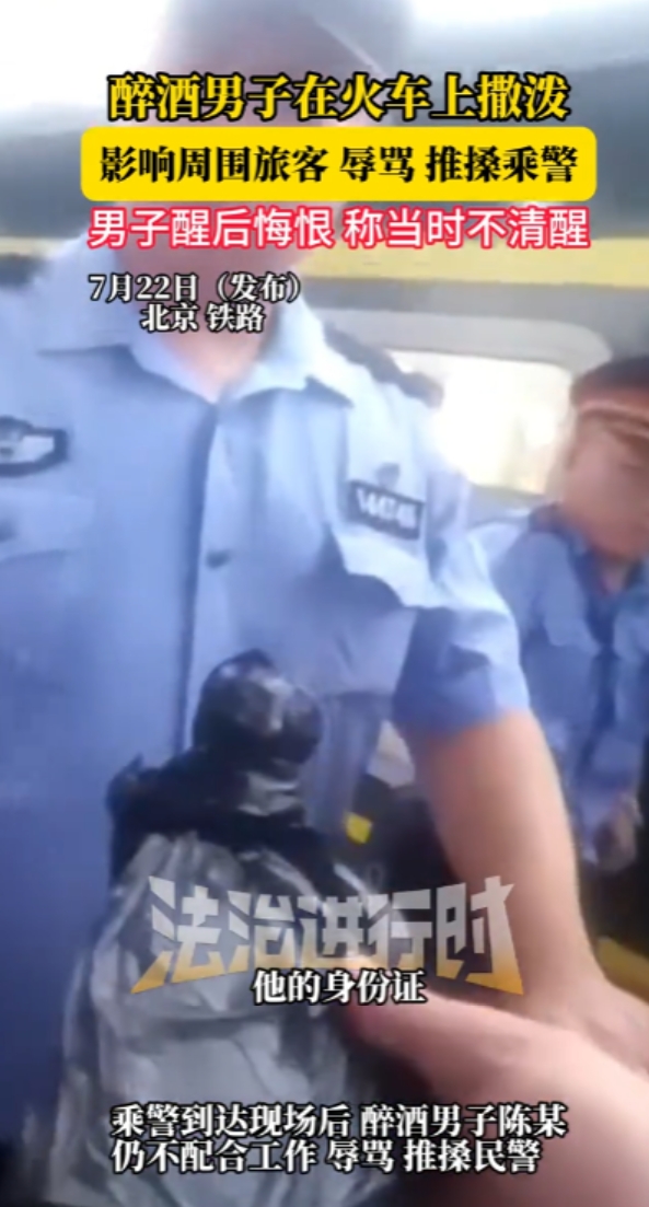 信息来源:《醉酒男子在火车上撒泼 影响周围旅客辱骂推搡乘警 男子醒后悔恨称当时不清醒》法治进行时