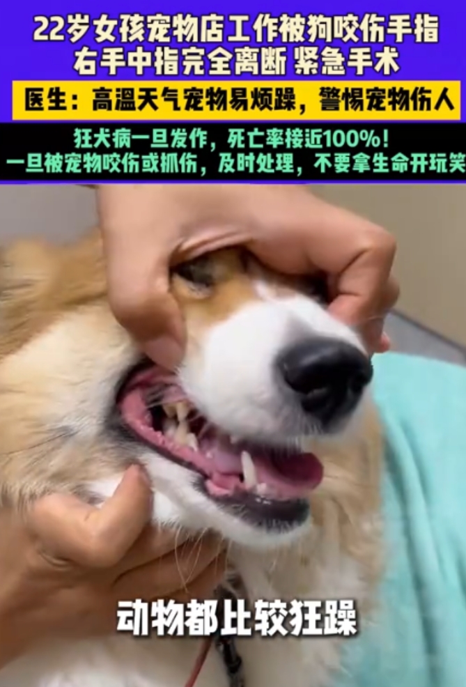 “太吓人了!”河南郑州,一22岁女子在宠物店给柯基洗澡时,没曾想,它竟然突然朝着女子发起攻击,由于躲闪不及,女子的手指被咬掉了一大截,女子赶紧捡起来被咬掉的手指,赶去医院治疗,医生表示如果狂犬病发作,死亡率基本100%。 据大象新闻7月18日报道,22岁女店员给宠物柯基洗澡,被咬伤手指。 当时女孩正蹲在浴缸边,给这只柯基打沐浴露。 小狗一开始还挺乖,尾巴摇得欢快,看着没啥异样。 可洗到后腿的时候,柯基突然像被踩了尾巴一样,一声尖叫,猛地回头对着她的手就是一口! 那一口特别狠,她只觉得手指一阵剧痛,低头一看,手指头被咬掉了一个尖,鲜血直流。 她当时吓懵了,赶紧把断指捡起来,拿毛巾包着止血,家人立刻开车把她送到医院抢救。 医生马上安排了接指手术,但也提醒她:情况不太乐观,神经和血管损伤严重。 而且更紧急的是,得赶紧打狂犬疫苗和破伤风针——就算这狗平时再乖,也不能完全排除感染风险,狂犬病那可是一旦发病基本无解的。 这事传到网上后,评论区瞬间炸锅。 有网友说:“爱宠物没问题,但养之前得先搞清楚它的行为习惯,不然就是拿自己冒险。” 也有人分享经验:“我家猫每次洗澡都要先剪指甲,用防滑垫,还得准备点零食安抚情绪。不做好准备就上,出事真不稀奇。” 其实狗子突然发脾气,大多数时候不是因为“坏”,而是它紧张、害怕或者觉得被侵犯了。 洗澡本来就容易让宠物不安,再加上泡沫、限制动作,很容易激发它们的防御本能。 现在很多人养宠物,只看到了“可爱”,却忽略了“责任”。 不知道狗有可能护食,不清楚猫会应激,还动不动就说“它从来不咬人”“我家狗最乖了”。 可一旦出了事,伤的不只是自己,有时候连别人也受牵连。 信源:大象新闻