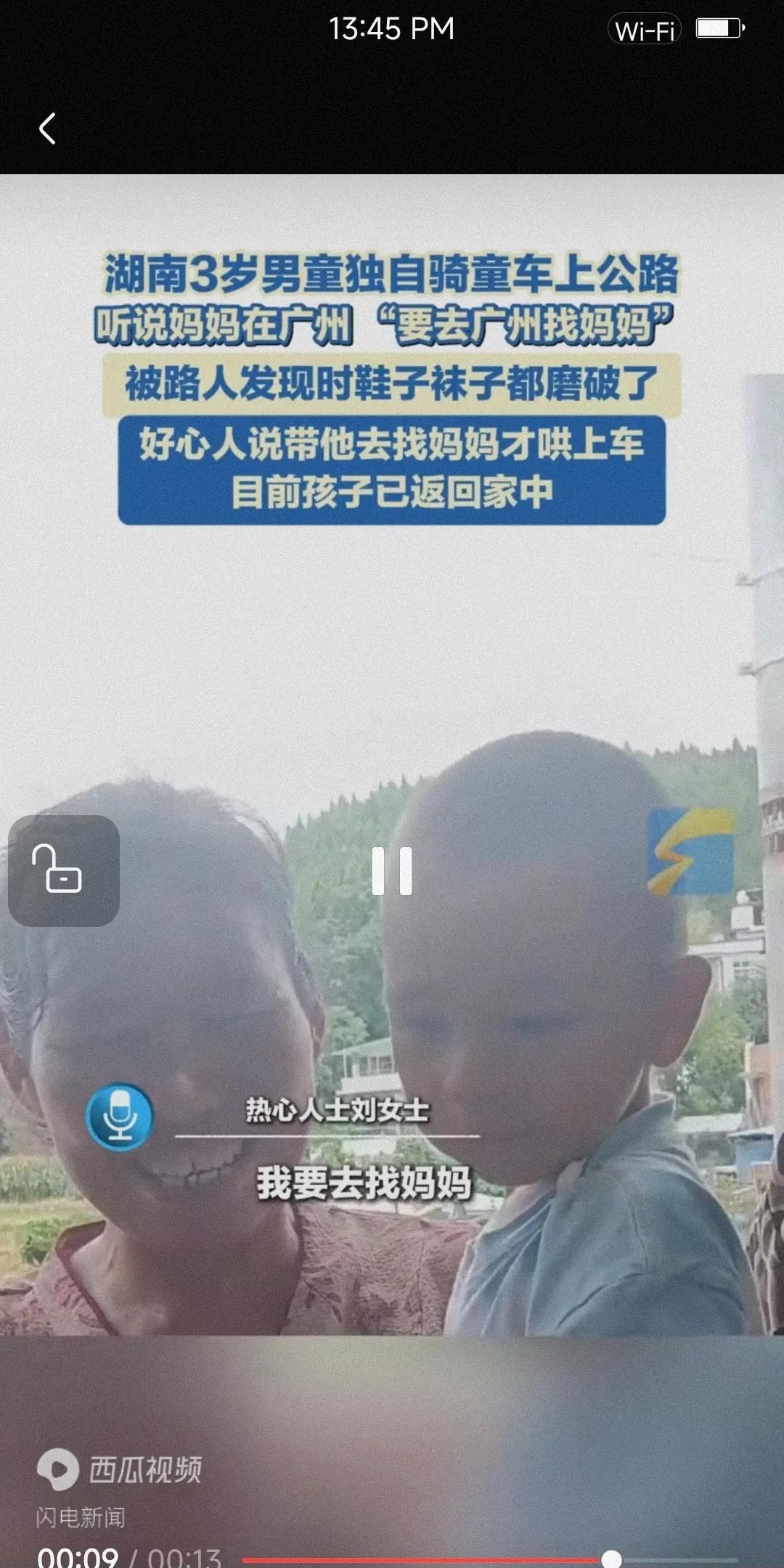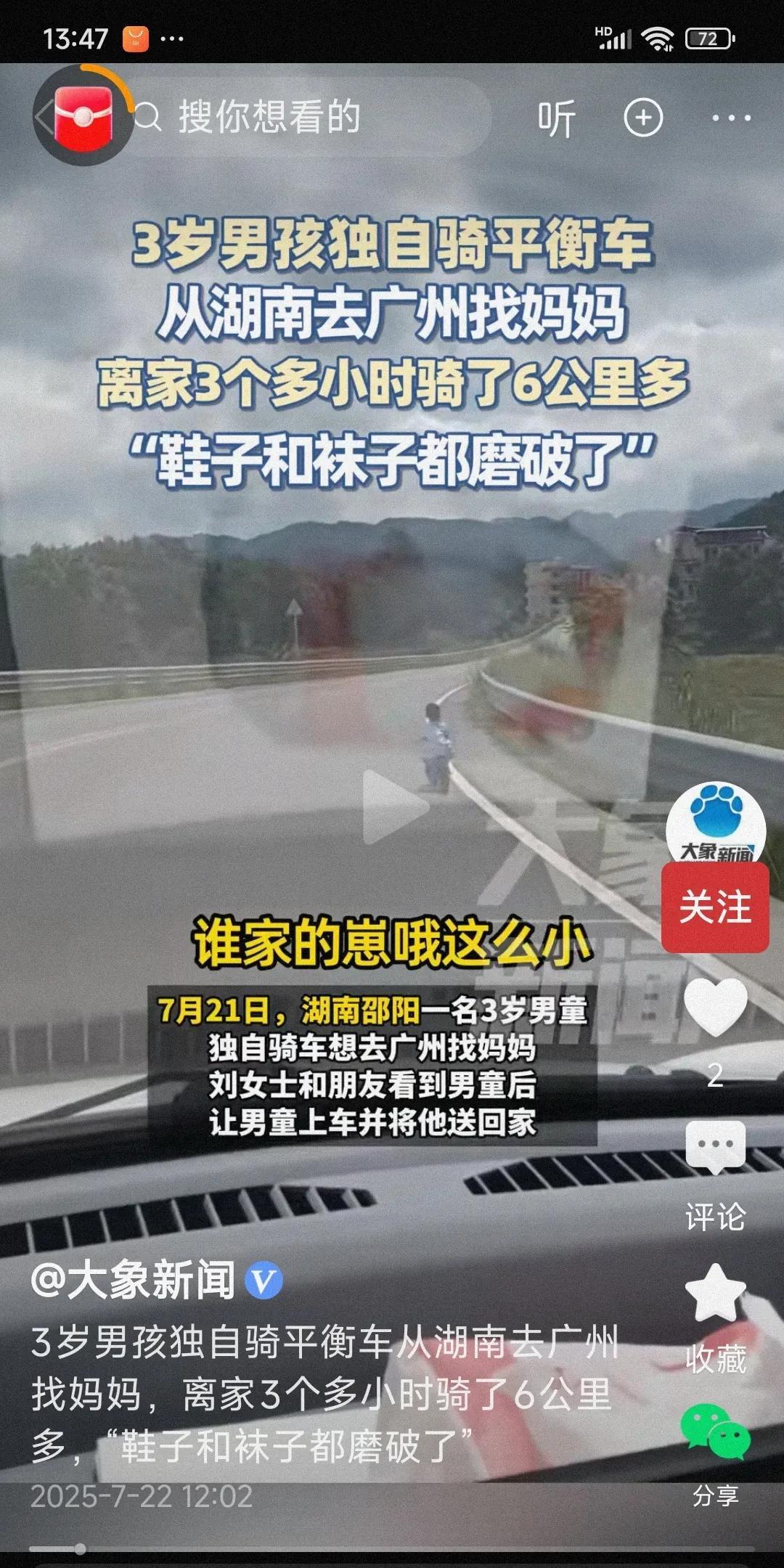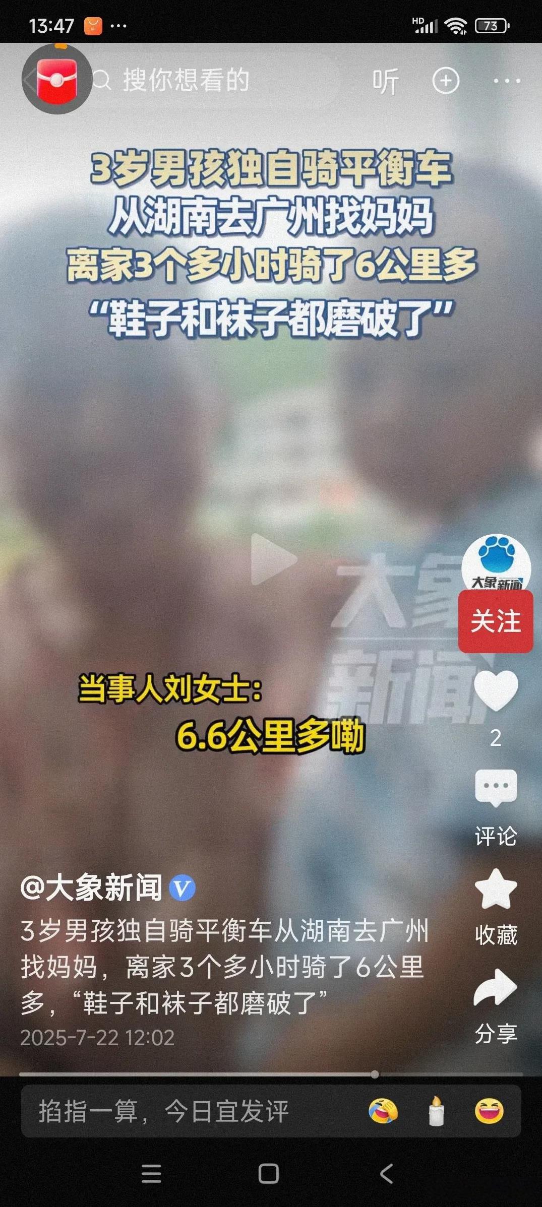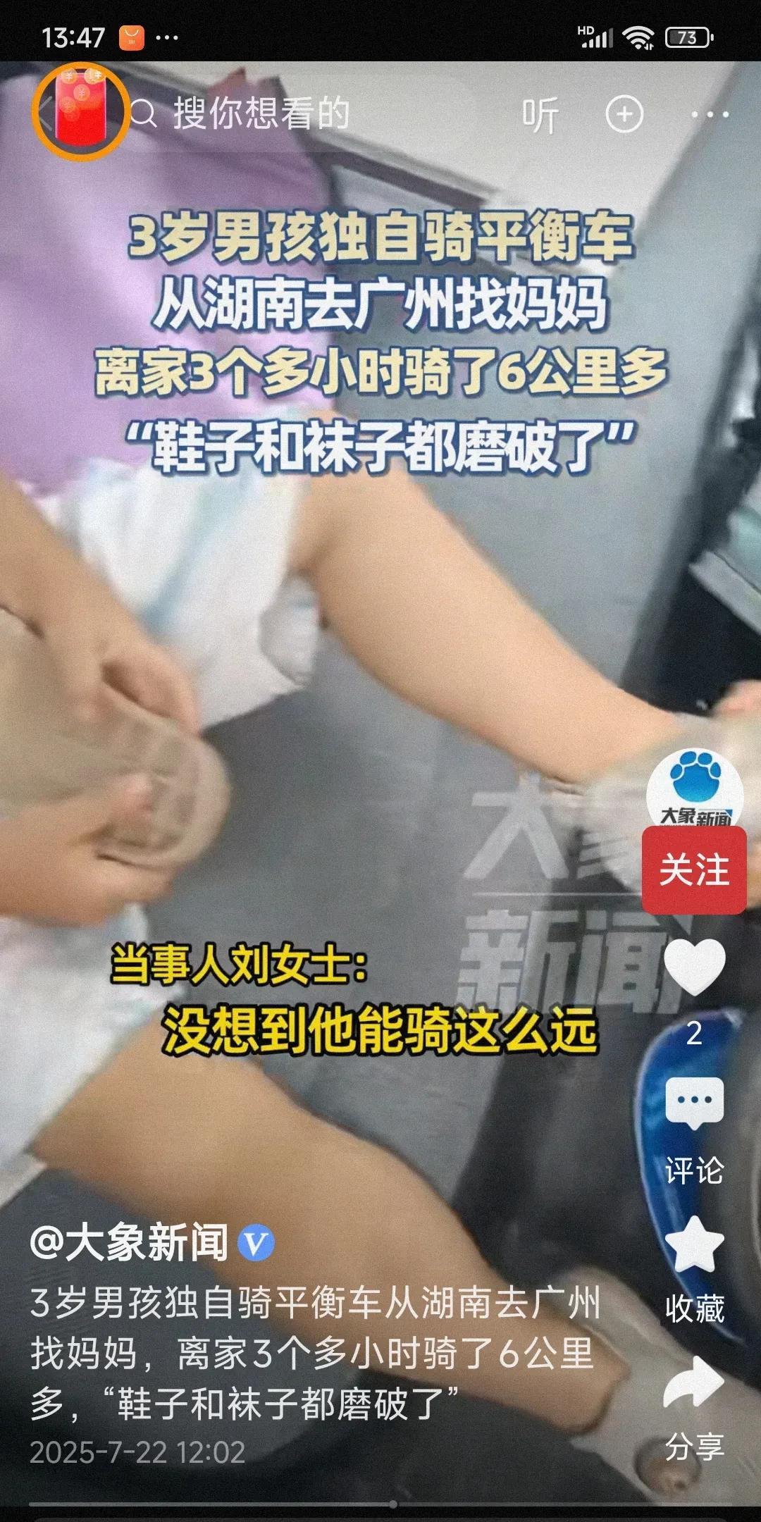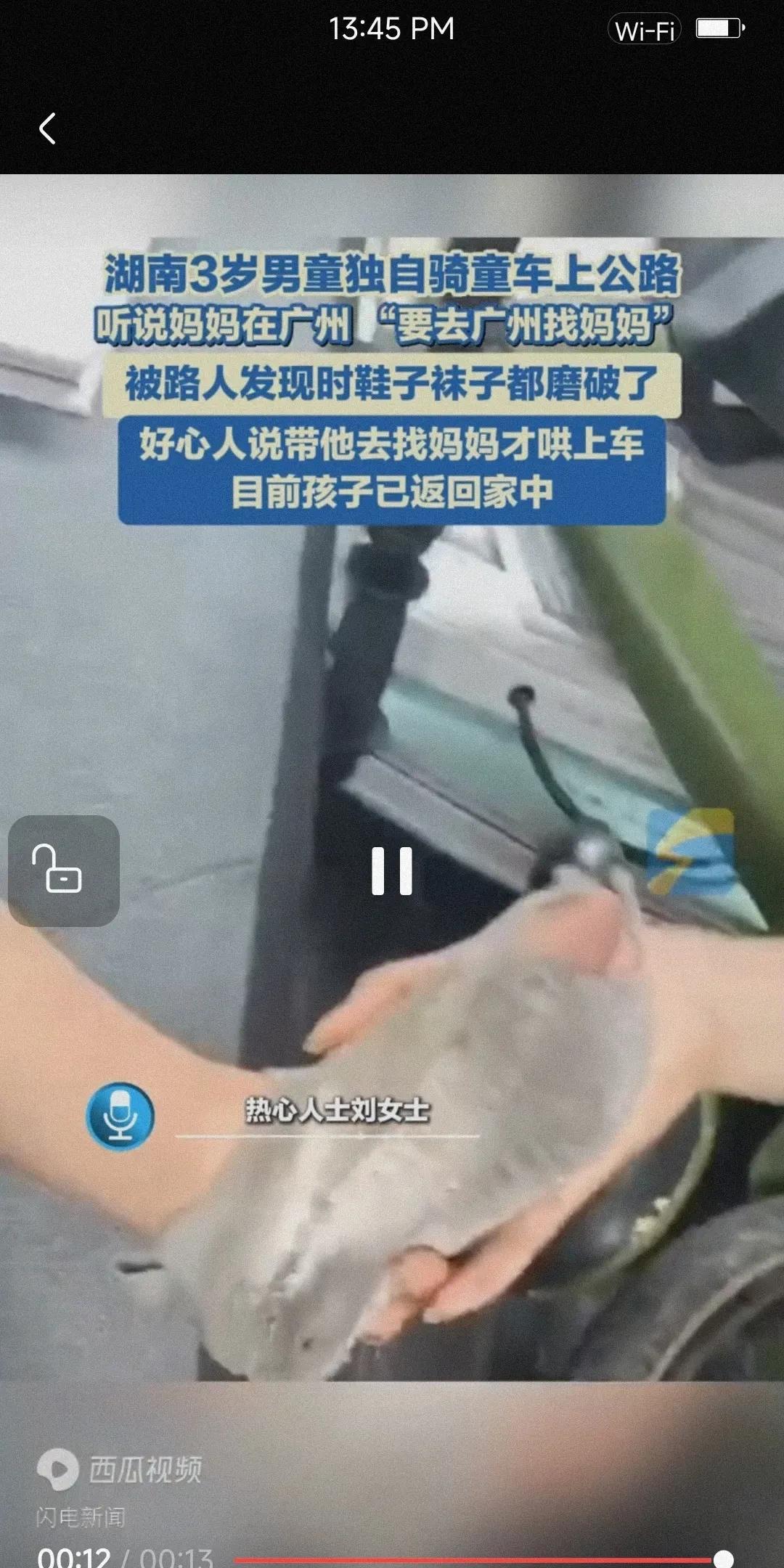 心疼这个3岁的娃!一个人从湖南出发,骑着平衡车,3小时走了6公里,鞋子都磨破了,扬言要到1000里以外的广州找妈妈! 刘女士在路上遇到他时,他已经从马坪骑到丁山了,大概走了6.7公里, 由于平衡车,基本靠“脚 摩地”,比较费鞋, 孩子的鞋子,袜子都磨破了,露出了大脚趾, 看他走得有点晃了,估计是脚疼了吧, 3小时,又没有带水,很累了, 当劝他上车时, 孩子还犹豫了,“我要找妈妈” “妈妈在哪里啊?” “在广州!” 爷爷奶奶在家里也急坏了, 找孩子,找了3个小时了, 这个小娃,着实让人心疼! 妈妈打工在外地,把他丢给爷爷奶奶, 不知道孩子是多想妈妈啊? 还好有个“平衡车”, 于是小家伙突发奇想, 自己骑车,去找妈妈! 所幸,被刘女士救回来了, 否则爷爷奶奶肯定会愧疚, 妈妈外地打工,也是为了孩子更好的生活啊!