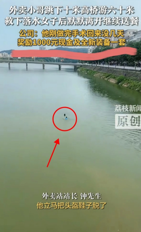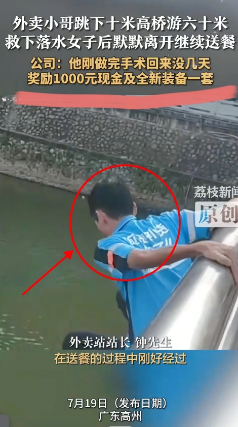 “上人民日报了!”广东茂名,50岁外卖员送餐经过大桥,突然跳下车,从10余米高桥跳下,迅速向水中间游去,原来是有人不慎落水,他将落水者救起之后,有人让他留下姓名和电话,可他却摆摆手离开:我还有餐没送。网友:湿漉漉的背影令人动容,为你点赞! “救命啊!救救我!谁能来救救我!”一位女子在河里面绝望的呼救着。 广东茂名的一名大哥,正像往常一样送着外卖,就在他经过鉴江河的时候看见桥边上围着一群人。大哥原本就是想凑个热闹没想到看见一名女子在河里面挣扎着,嘴里还大声叫着救命。 大哥察觉到女子渐渐体力不支就想下去帮帮这名女子,就想着要救下女子。于是大哥二话不说就翻过护栏从十余米高的桥上跳进了河里,快速的游到女子身边将女子救到了岸上。大哥将女子送到了岸边好心人的手上之后就转身离开。 岸上面的好心人拉着大哥询问大哥的名字时,大哥表示自己就是一个路人,现在还有外卖没送就离开了。好心人看到大哥那瘦弱的背影对大哥很是钦佩,岸上有人将这件事全程录了下来发到了网上。 视频一经发出,网友们纷纷称赞大哥见义勇为。致敬大哥能从那么高的地方跳下来已经需要很大的勇气了,还游了那么远去救人,真的是拿命在救人。 官方记者看到了这件事情,专门找到了大哥的家里面对大哥进行采访。大哥表示当时来不及多想,就想着得赶紧救人。 经过了解,大哥叫吕炜权,如今已经五十岁了。一周前刚刚做完胆囊手术,医生叮嘱大哥要静养两周,但是大哥为了偿还手术时欠下的债务,手术后一周就开始继续送外卖。 事后外卖的官方平台也向吕大哥颁发了“蓝骑士社区侠”荣誉称号并给予现金奖励,阿里公益也发出“天天正能量特别奖”,两项奖金共计两万元。次日,吕大哥所在的公司也对大哥进行了表彰慰问,送上了锦旗、新的装备和一千元奖金。 被救的人在身体好了之后也前往吕大哥家里,对吕大哥表达感谢。称吕大哥不仅是救了女子一人,更是挽救了女子一家。如果不是吕大哥她肯定就活不成了。表示吕大哥今后有需要帮助的地方尽管开口,一定会义不容辞的帮忙。 网友们了解到了具体情况,表示这种正能量的事情一定要大力宣扬,希望大家出门在外要做一个见义勇为的人。同时希望大家如果遇到这样的情况,及时做好保护措施之后再实施救人,防止人没救上来反而将自己搭进去。 也有很多网友看吕大哥身穿外卖员的衣服,表示以后一定会尊重每一个外卖员,如果有外卖员出现超时的情况可能是在救人。以后在路上遇到外卖员一定让外卖员先走。 一个善良的人引发了这么大的轰动,希望以后社会上能有更多的好人。网上也有更多正能量的内容。 对于这件事情你们有什么看法?