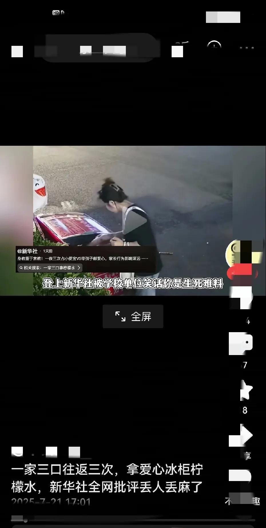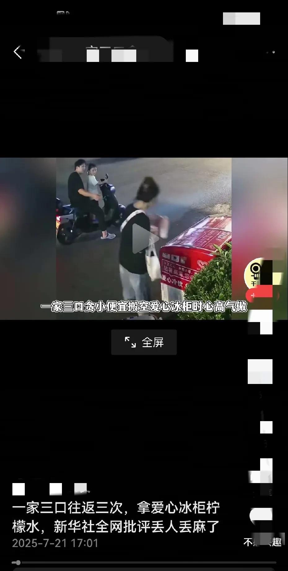 杭州这一家三口的行为,真的很不地道。爱心冰箱,是给户外工作者准备的,偶尔路人拿一两杯,解渴也能理解。但这一家人,往返三次取水,就太过分了。父母的行为,还会影响孩子,在孩子面前,这样贪小便宜,孩子可能会觉得,这是正常的。就像之前那个代驾男子用塑料袋,装走很多瓶水一样,他们都只想着,自己占便宜。被新华社批评也是活该,他们的这种行为破坏了,爱心冰箱的初衷,也让社会的公序良俗蒙羞。在公共资源面前,还是要有基本的道德底线,才能够做人做事。