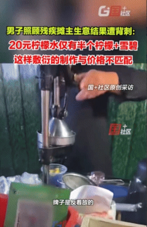 可怜人必有可恨处!江苏扬州,一男子街边遇到残疾人摆摊,想着过去支持下,就点了杯柠檬水,可看到制作过程时,却感觉自己被“背刺”了,对方只是将半个柠檬榨汁,再倒些饮料,就这样,一杯价值20元的柠檬水好了! 7月17日,江苏扬州街头发生的一件事,让不少人心里堵得慌。 本来是带着好心去支持残疾人创业,结果却像是被泼了盆冷水,这样的事儿任谁碰上都得难受好一阵子。 事发当天,傍晚时分,一位男子路过时看到了一个特别的摊位。 摊主是个五十多岁的大叔,右边的袖子空荡荡的,有人跟他搭话,他也不回应,只是用手比划着交流。 他的三轮车停在路边,车上摆着几筐东西,还有一箱雪碧,旁边立着块塑料牌子,看样子是标价格的,但牌子正面却朝里翻着,路过的人根本看不清上面写了啥。 这位男子看着大叔这样自力更生,觉得挺不容易的。 谁都知道残疾人出门讨生活难,能靠自己摆摊挣钱,这份骨气值得帮一把。 他没多想,也没问多少钱,就想着支持一下,直接说要一杯柠檬水。 可接下来的场面,让他心里越来越不是滋味。 只见摊主拿起半个柠檬,随便在杯子上挤了两下,柠檬汁没多少,接着就从旁边拿起雪碧,往杯子里倒了些,一杯柠檬水就这么做好了。 整个过程快得很,看着也特别敷衍,完全不像正经做生意的样子。 等男子付完钱,才知道这杯简单到不能再简单的水,竟然要20块钱。 他当时就愣住了,手里拿着杯子,越想越不对劲。 这半个柠檬加几口雪碧,怎么看都不值这个价,再想想制作过程里可能存在的卫生问题,最后他也没敢喝,找了个地方把水倒掉了。 同时他还回忆起,摊主一开始根本没把价格牌亮出来,直到要付钱了,才把牌子拿出来。 仔细一算,就这半个柠檬和一点雪碧,成本最多也就三四块钱,卖20块钱确实说不过去。 也正是这样一算,男子感到不舒服到了极点,将此事爆料至了网上。 很快,男子的遭遇得到了大家的同情。 其实大家对残疾人摆摊都带着一份体谅。 谁看到人家身有不便还在努力生活,心里都会软一下,想着能帮就帮一把。 可这种善意不是凭空来的,是大家对努力生活的人的尊重,也是社会该有的温度,但不该变成某些人赚钱的空子。 做生意最基本的就是明码标价,不管是谁摆摊,卖什么东西,都得让人家知道多少钱,值不值这个价。 这位摊主把价格牌朝里放,等付钱了才亮出来,这本身就不地道。 再加上制作过程这么敷衍,用这么简单的材料卖高价,这不就是借着大家的同情心做生意吗? 有人说,残疾人做生意不容易,贵一点也正常。 可不容易不是糊弄人的理由,更不是漫天要价的借口。 大家愿意多花点钱支持,是因为尊重这份自力更生的骨气,而不是因为对方是残疾人就必须当冤大头。 要是都这么干,以后谁还敢随便帮人?好心帮了忙,结果还被“背刺”一下,换谁心里都不好受。 类似的事儿其实不止这一件。 之前四川乐山有位女士为了照顾一位大爷,准备买他的菜,本来该付5块钱,结果不小心把2000块现金递了过去。 可卖菜的大爷一把就把钱塞进后腰,等女士发现钱没了问他,他还说只看到5块钱,甚至假意提醒是不是掉路上了。 最后还是民警调了监控,才把钱追回来。 不管是扬州这位摊主,还是乐山的卖菜大爷,他们都算准了大家的善意和信任。 觉得人家出于好心不会计较,或者觉得年纪大、身体不方便能被体谅,就钻了这个空子。 可这样的行为,伤的是那些真正想帮忙的人的心。 普通人出门在外,看到需要帮衬的人,伸把手是应该的。 但帮忙归帮忙,该问清楚的还得问清楚。买东西之前问问价格,看看东西怎么样,这不是小气,是对自己的钱负责,也是对那份善意负责。 别不好意思开口,要是连价格都不敢问,最后受了委屈,不光自己添堵,还可能让更多人不敢再做好事。 而那些靠摆摊谋生的人,不管有什么难处,都得守住做生意的本分。 明明白白标价,踏踏实实做事,这样大家才愿意真心支持,要是总想着走捷径,利用别人的同情心赚钱,就算一时能赚到钱,时间长了没人信了,最后丢了口碑,日子只会更难。 说到底,善良是个好东西,值得被珍惜,而不是被消费。 大家的善意应该给那些真正努力、诚信经营的人,而不是给那些钻空子、耍小聪明的人。 希望这样的事儿以后能少点,让街头的善意都能得到应有的尊重,让每一份帮忙都能明明白白、踏踏实实。