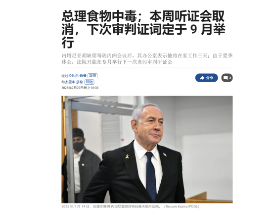 当地时间7月20日,以色列总理办公室对外宣布,内塔尼亚胡因“食物中毒”将暂时在家办公,预计未来三天无法履行正常职责。这意味着原定于7月21日至22日举行的内塔尼亚胡刑事审判听证会因其健康原因被迫推迟。考虑到法院即将进入夏季休会期,该休会期将持续至9月5日。 换句话说,内塔尼亚胡的下一次作证将推迟至9月进行。自去年12月开始作证以来,内塔尼亚胡已经因各种原因第7次推迟出席相关审判。 真是够狠的,为了回避与贪腐指控相关的听证会,这位总理真是对自己下得了狠手!