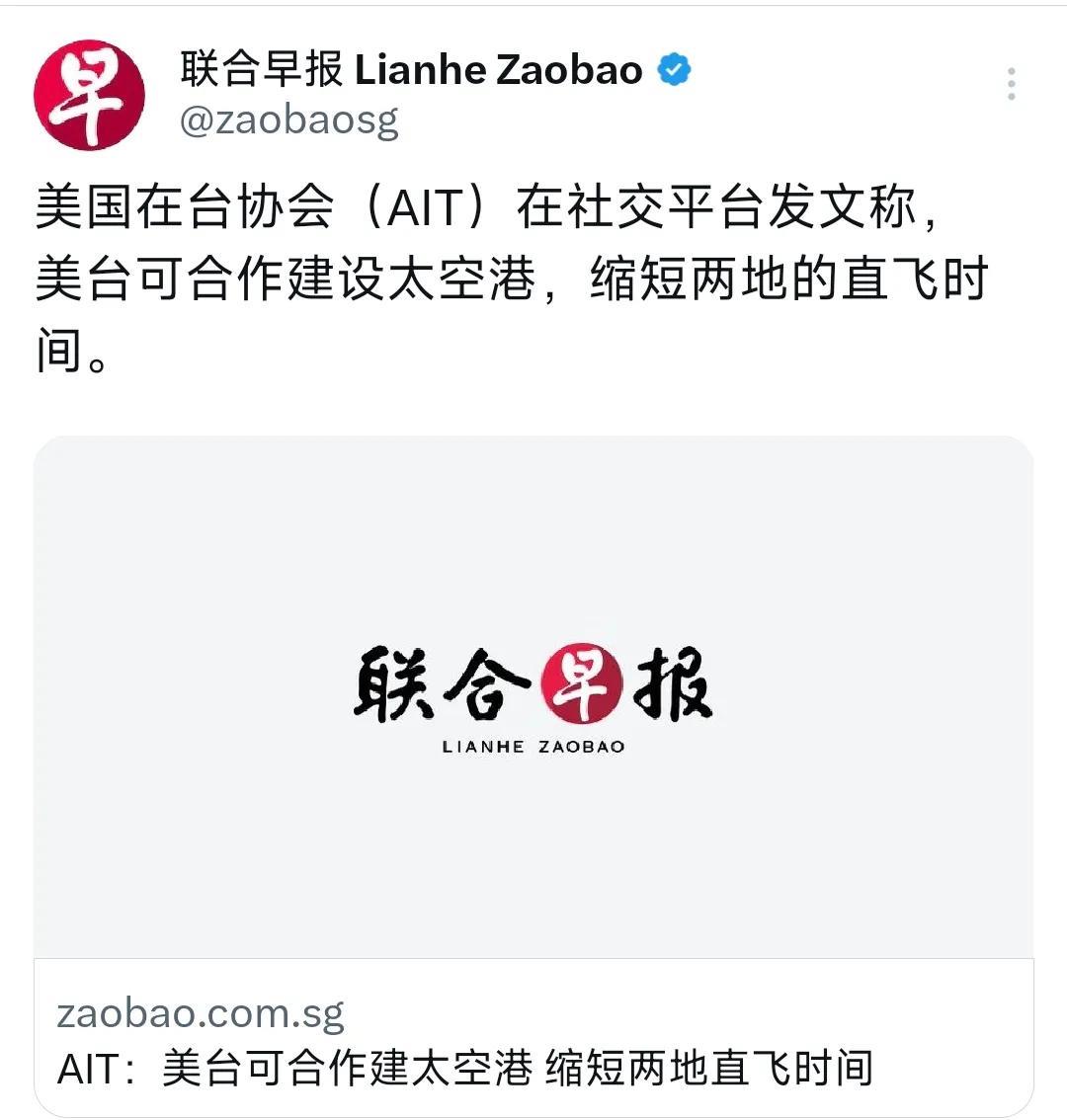 外媒今天(7月22日)报道:“美国在台协会(AIT)在社交平台发文称,美台可合作建设太空港,缩短两地的直飞时间。” [机智]评几句:高雄车站都修多久了,眼看着快20年还没个定数。和一个连卫星都发射不了的台湾地区讨论亚轨道飞行器,这不就是明摆着骗钱把戏吗?美国此举不过是想从台湾身上搜刮利益。不过,我们必须高度警惕、密切关注,这其中是否存在美台军事勾连的阴谋,绝不能让任何危害国家主权和安全的行为得逞。