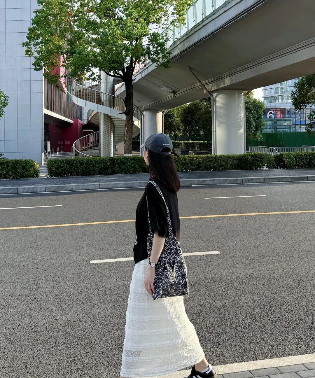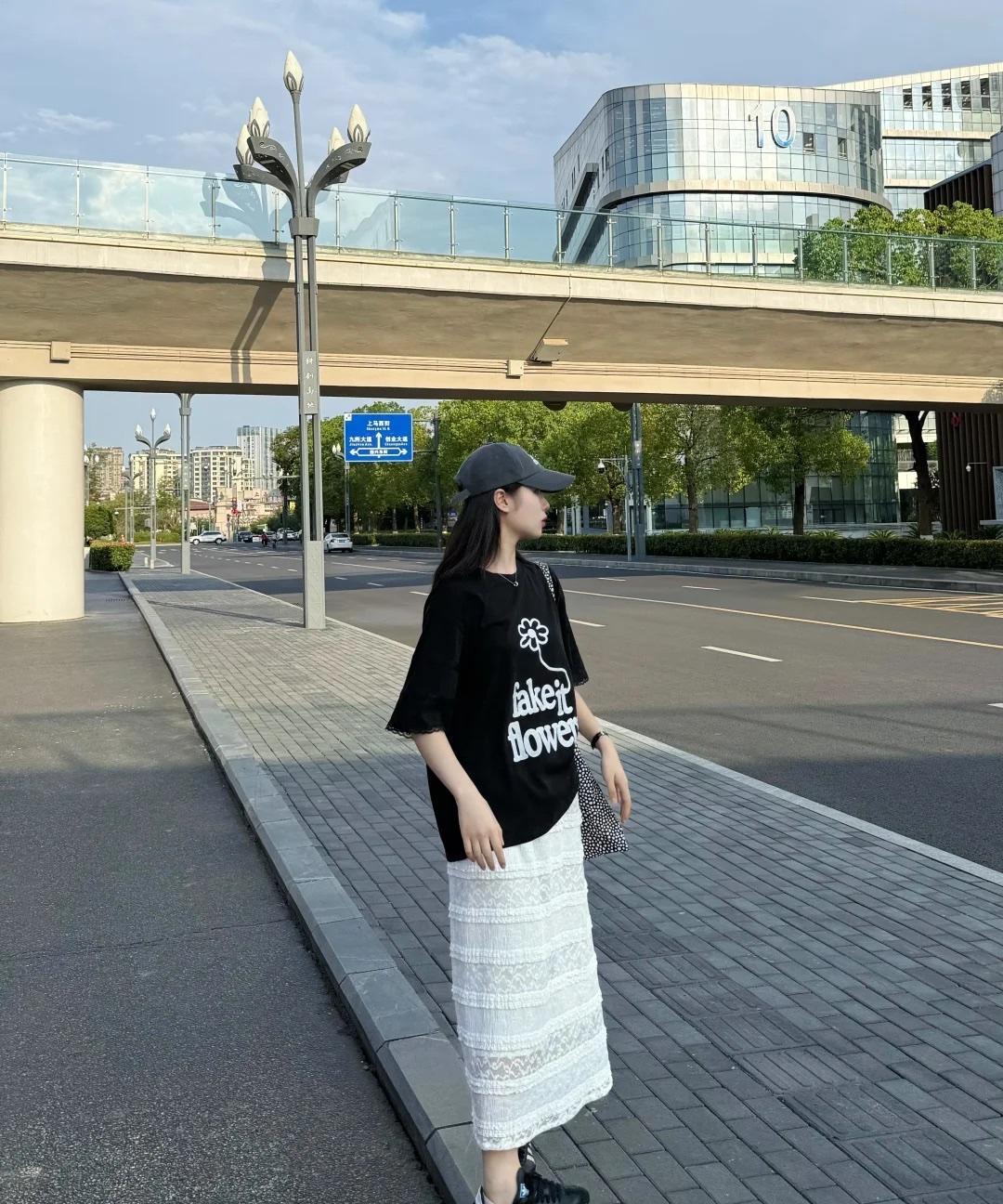 舒适自在的黑白配,怎么也看不厌呀! 黑色印花的廓形T恤,是这种松垮的中长设计, 下摆不用刻意的塞衣角,搭配一条白色长裙慵懒休闲又文艺。 日常出街,像博主搭配棒球帽和帆布包,休闲氛围感拉满,很减龄!