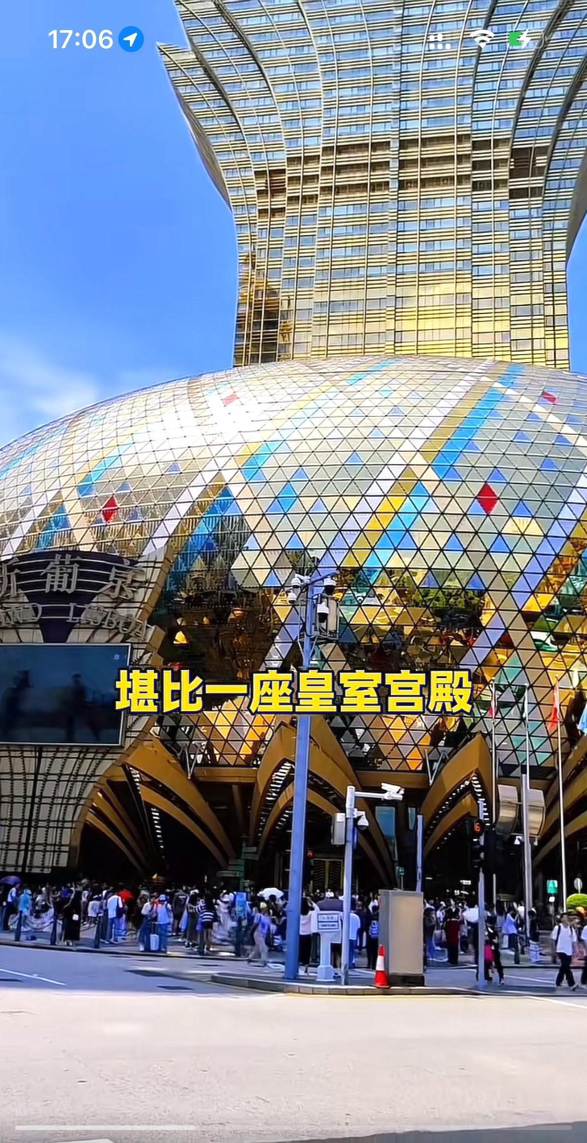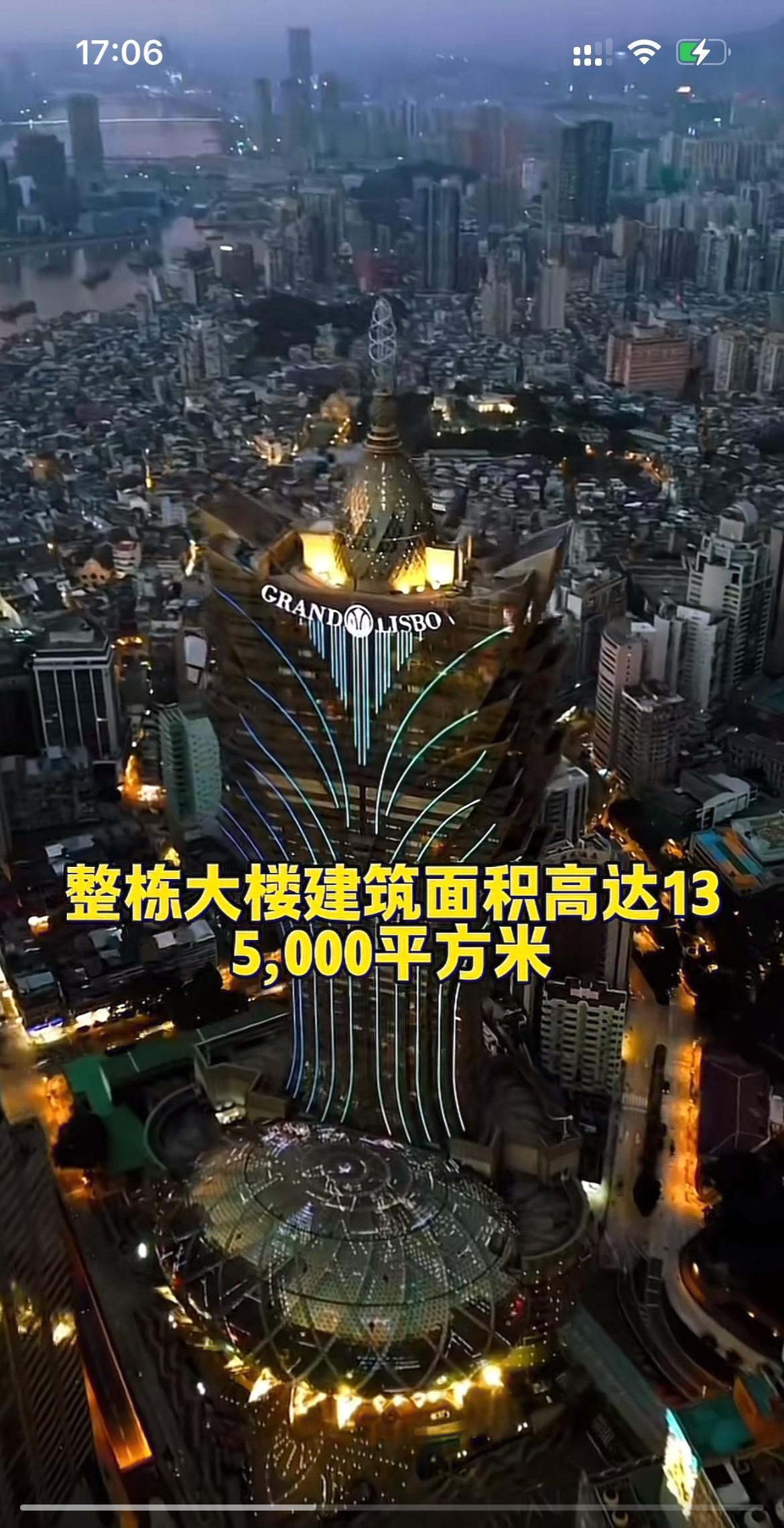 澳门第一高楼新葡京酒店,由澳门赌王何鸿燊于2007年投资近50亿建造,整个外观装修金碧辉煌,整栋大楼高258米共58层,堪比一座皇室宫殿。
