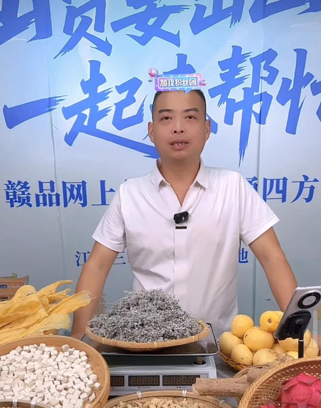 姚家男儿今天下午直播,直播间600多人,卖的是赣南的特产! 背景墙写着: 山货要