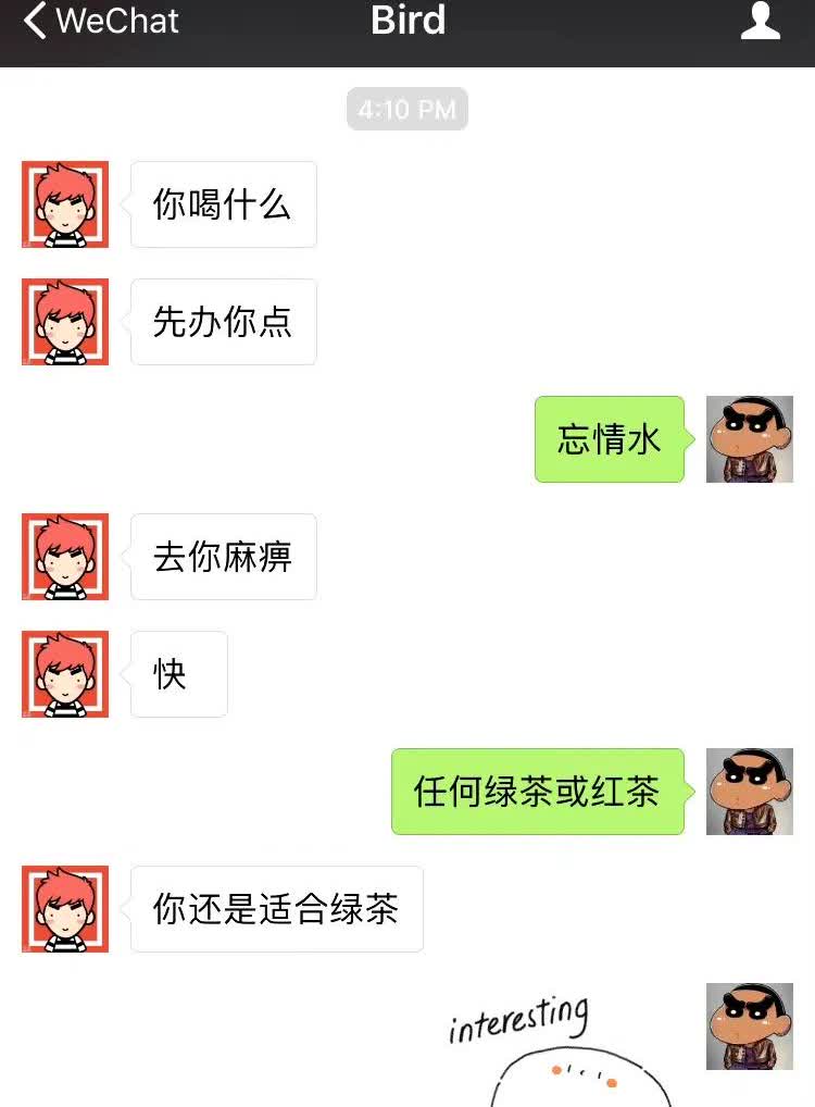考古醒远,张远约苏醒喝东西:你喝什么,先帮你点。苏醒:忘情水。张远暴怒:快!苏醒:任何绿茶或红茶。张远:你还是适合绿茶… 苏醒小号吐槽:我认为这是对我缺乏尊重和了解的表现 张远大号赶来无语一下:[微笑]