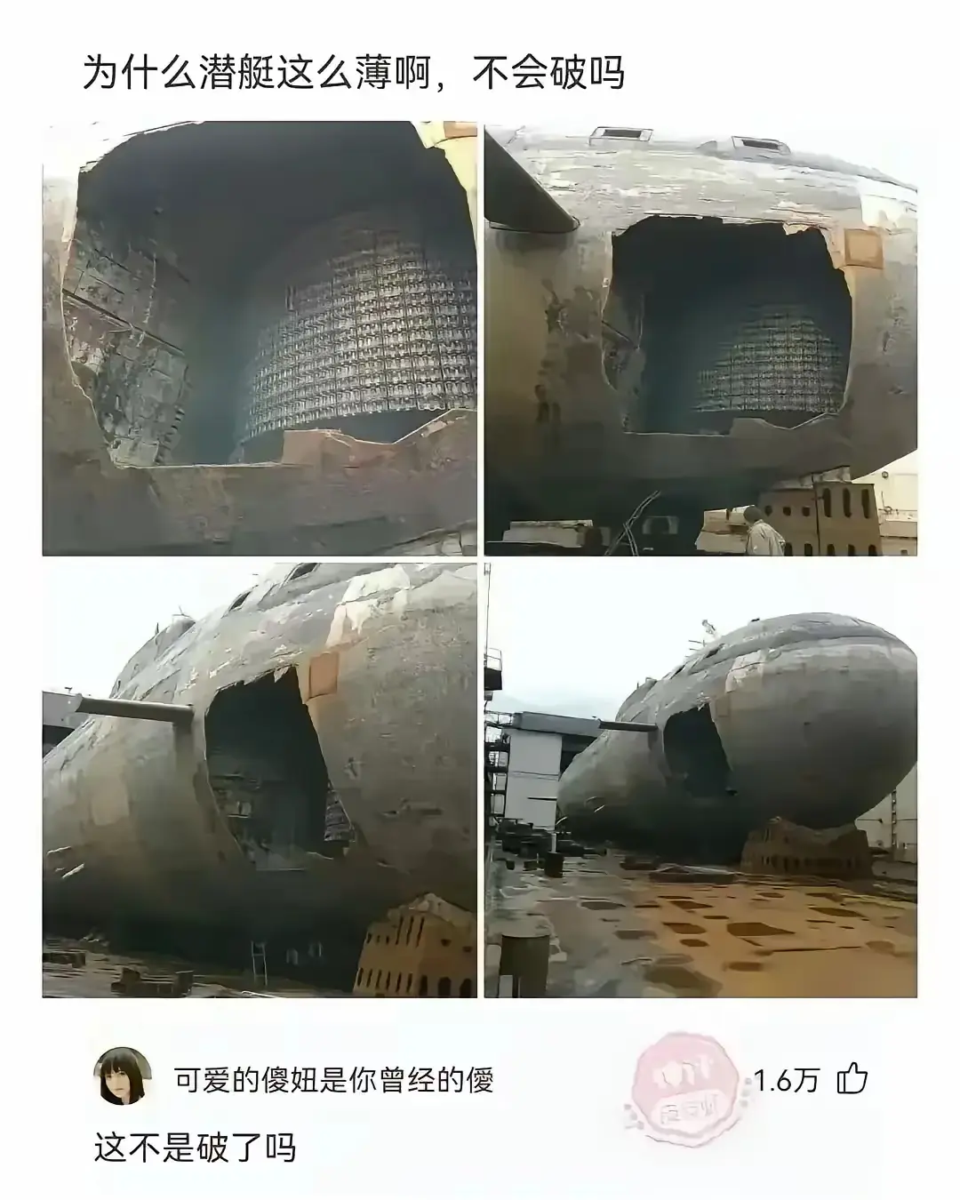 毛子的潜艇吧,看着像。毛子潜艇是双壳结构,耐压壳在内部,外不就一层薄皮